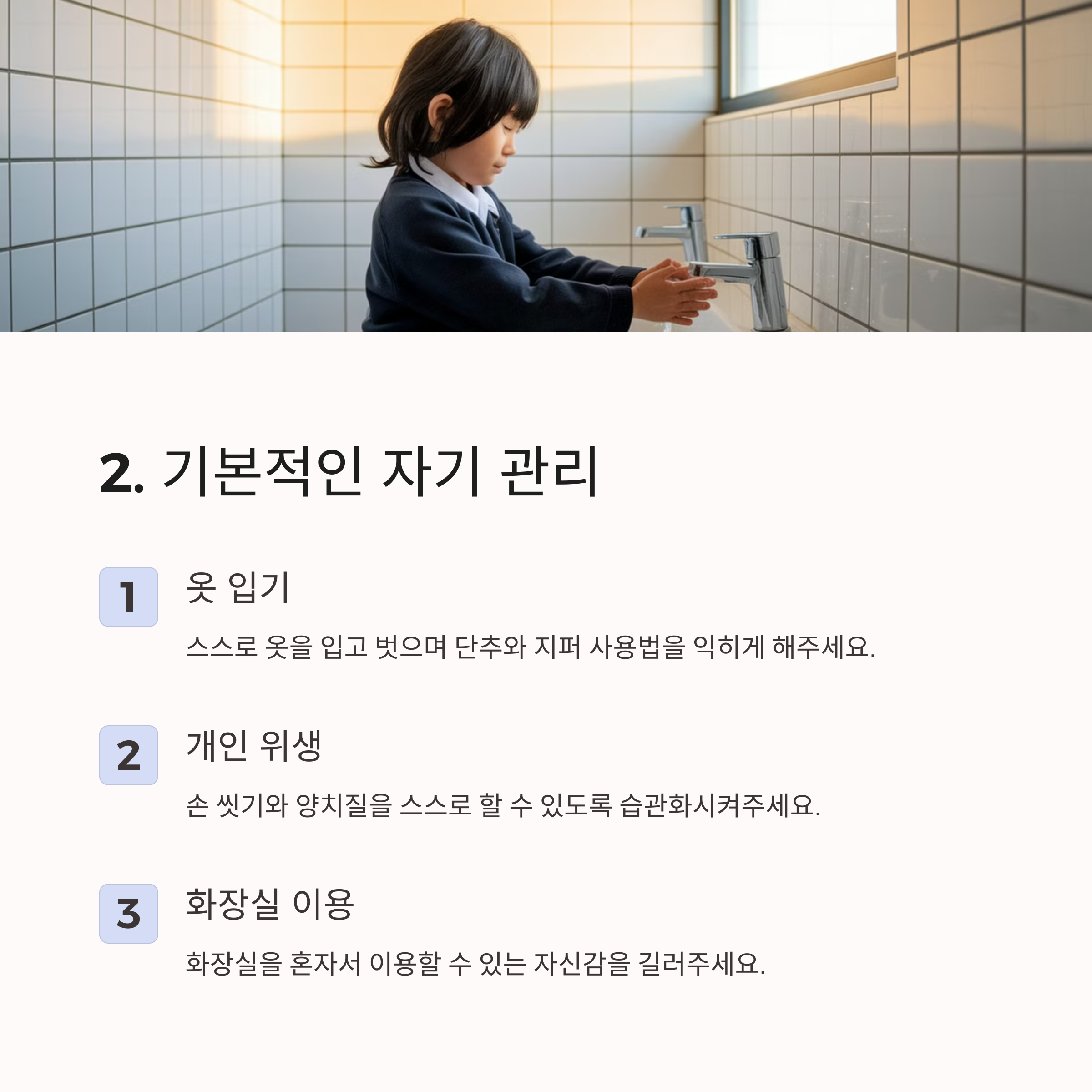 손 씻기, 양치하기 등의 기본적인 자기 관리를 익혀야 합니다.