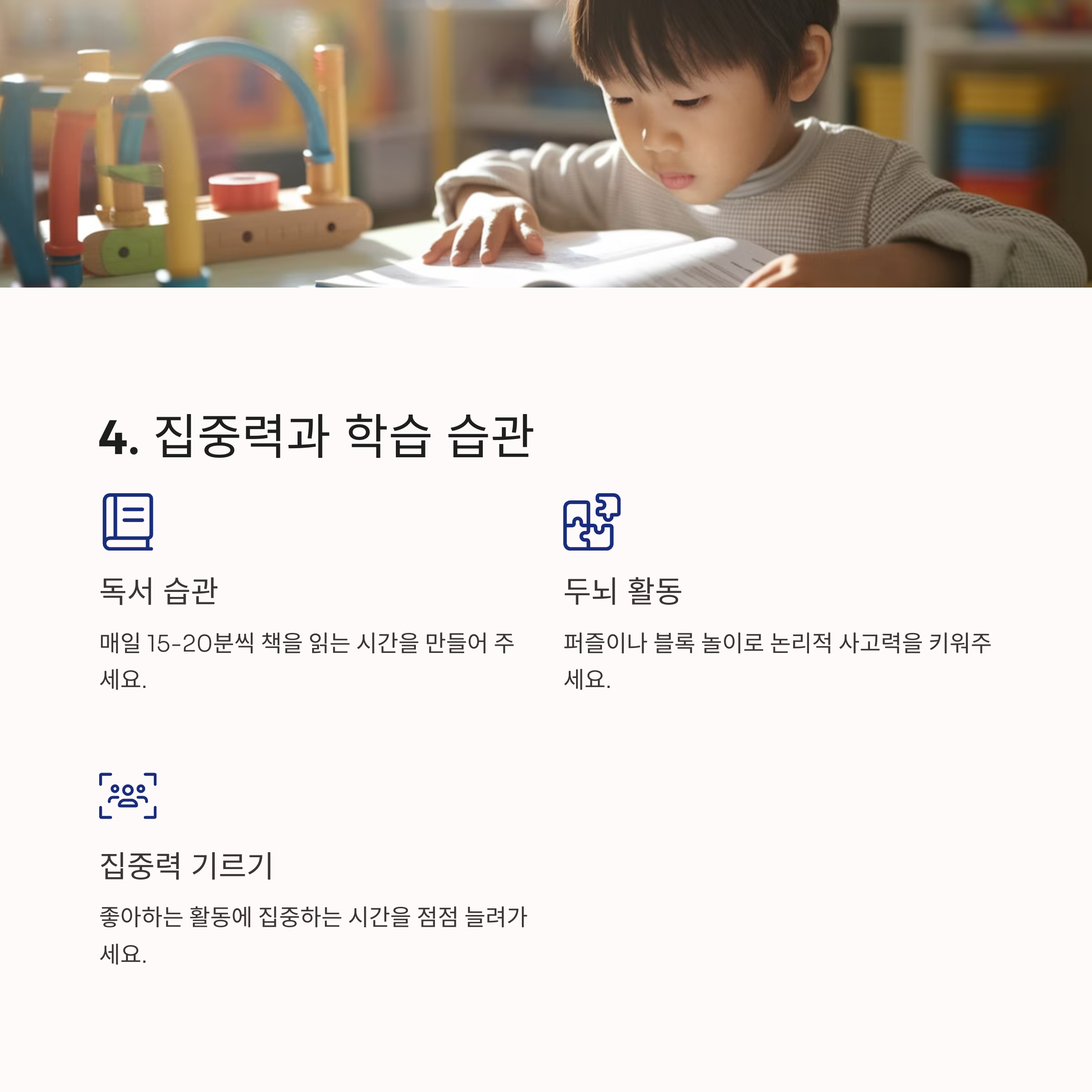 책 읽기나 놀이 활동을 통해 집중력을 키웁니다.