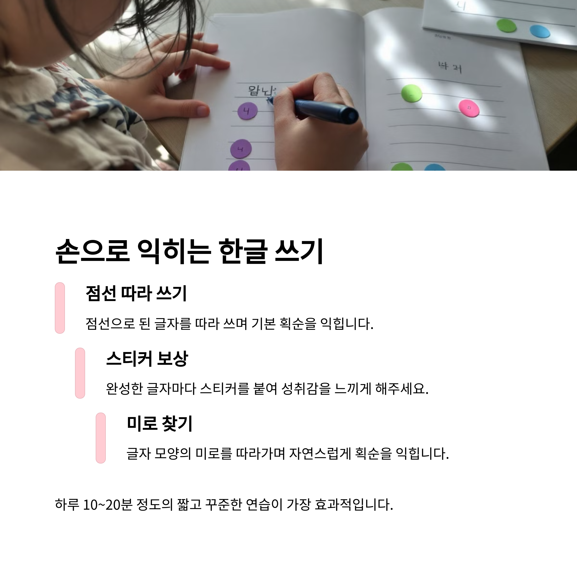 | 한글 학습 시작 시기 | 5~6세부터 자연스럽게 시작하는 것이 좋아요. |