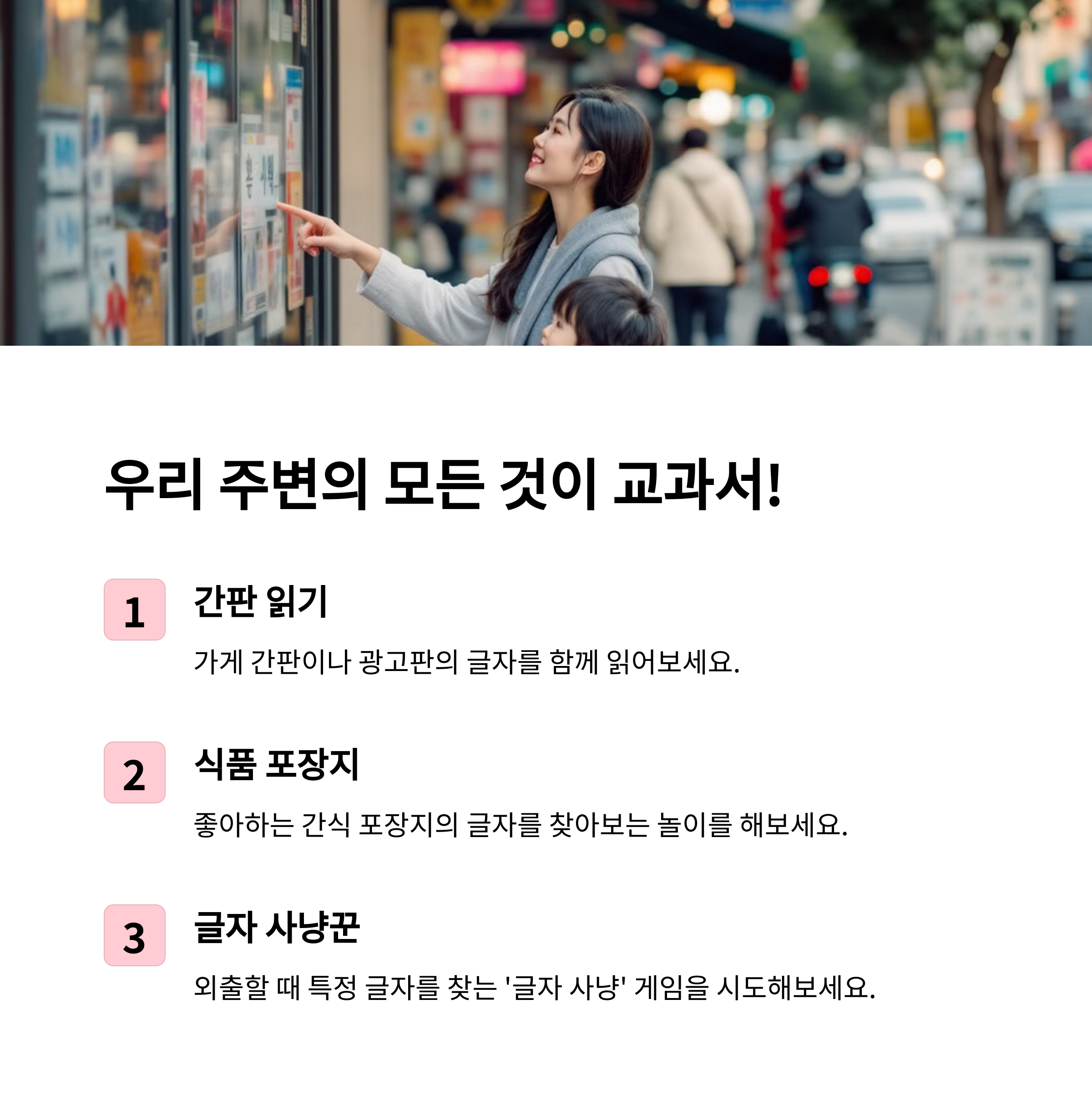 | 5~6세부터 자연스럽게 시작 | 소리 중심 학습법 활용 | 카드 게임, 그림책 읽기 |