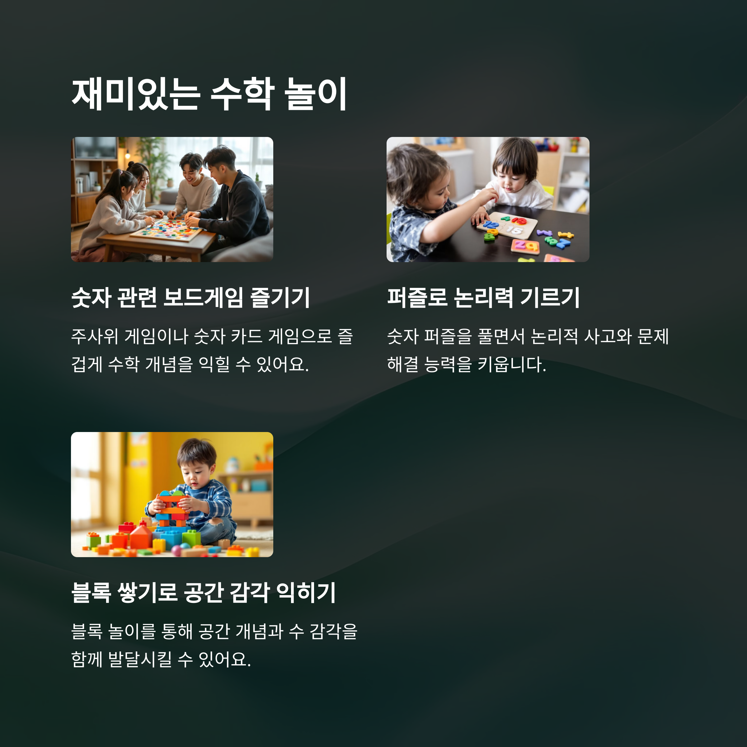 아이들이 수학을 재미있게 익힐 수 있도록 놀이를 활용하는 것도 좋은 방법입니다. 보드게임, 블록 쌓기, 퍼즐 맞추기 같은 활동은 논리적 사고력과 수 개념을 키우는 데 도움이 됩니다. 또한, 간단한 마트 놀이를 통해 돈의 개념을 익히는 것도 효과적입니다. 일상 속에서 부모님이 직접 수학적인 질문을 던지고 아이가 스스로 답을 찾을 수 있도록 유도해보세요. 수학은 어렵고 지루한 것이 아니라, 우리 생활 속에서 쉽게 경험할 수 있는 흥미로운 학문이라는 것을 알려주는 것이 중요합니다.