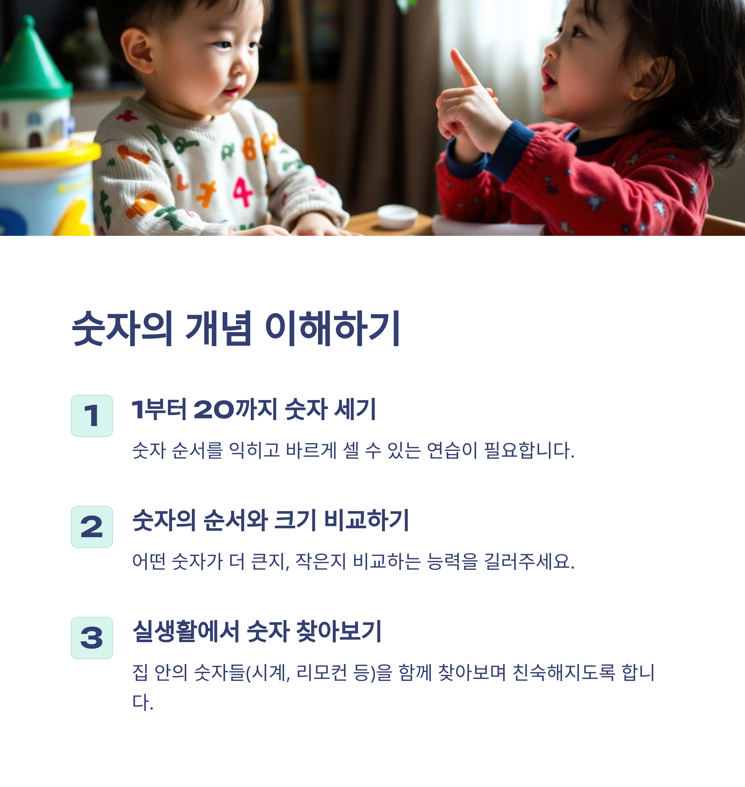 | 숫자의 순서와 크기 비교 | 덧셈과 뺄셈의 개념 이해 | 놀이와 생활 속 수학 활용 |