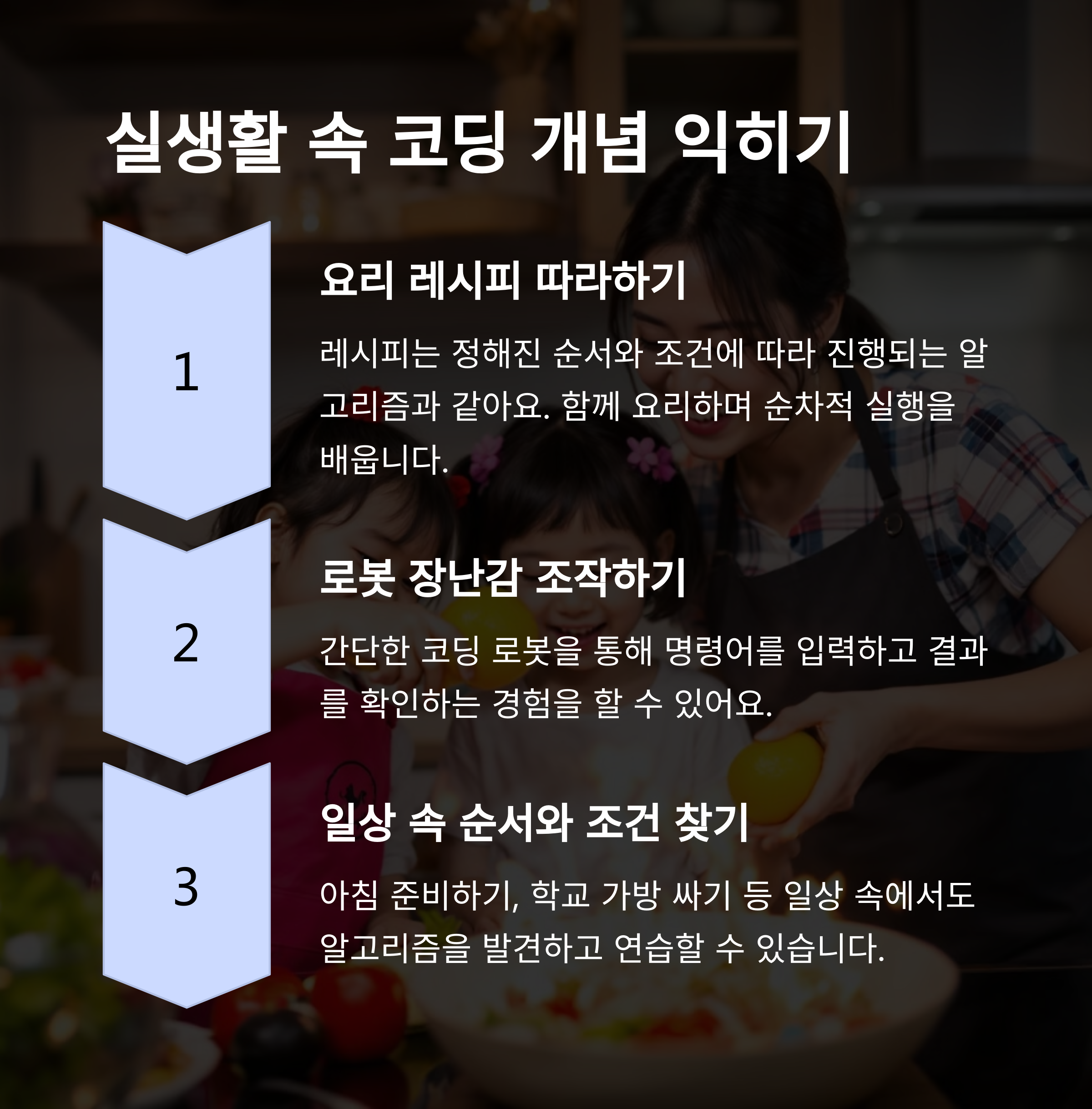 코딩을 어렵게 생각하지 않고, 실생활 속에서 쉽게 접하는 것도 중요합니다. 예를 들어, 요리 레시피를 따라 하거나 로봇 장난감을 조작하는 활동을 통해 순서대로 명령을 수행하는 개념을 익힐 수 있습니다. 부모님과 함께 간단한 코딩 프로젝트를 진행해보는 것도 아이들의 흥미를 높이는 좋은 방법입니다.