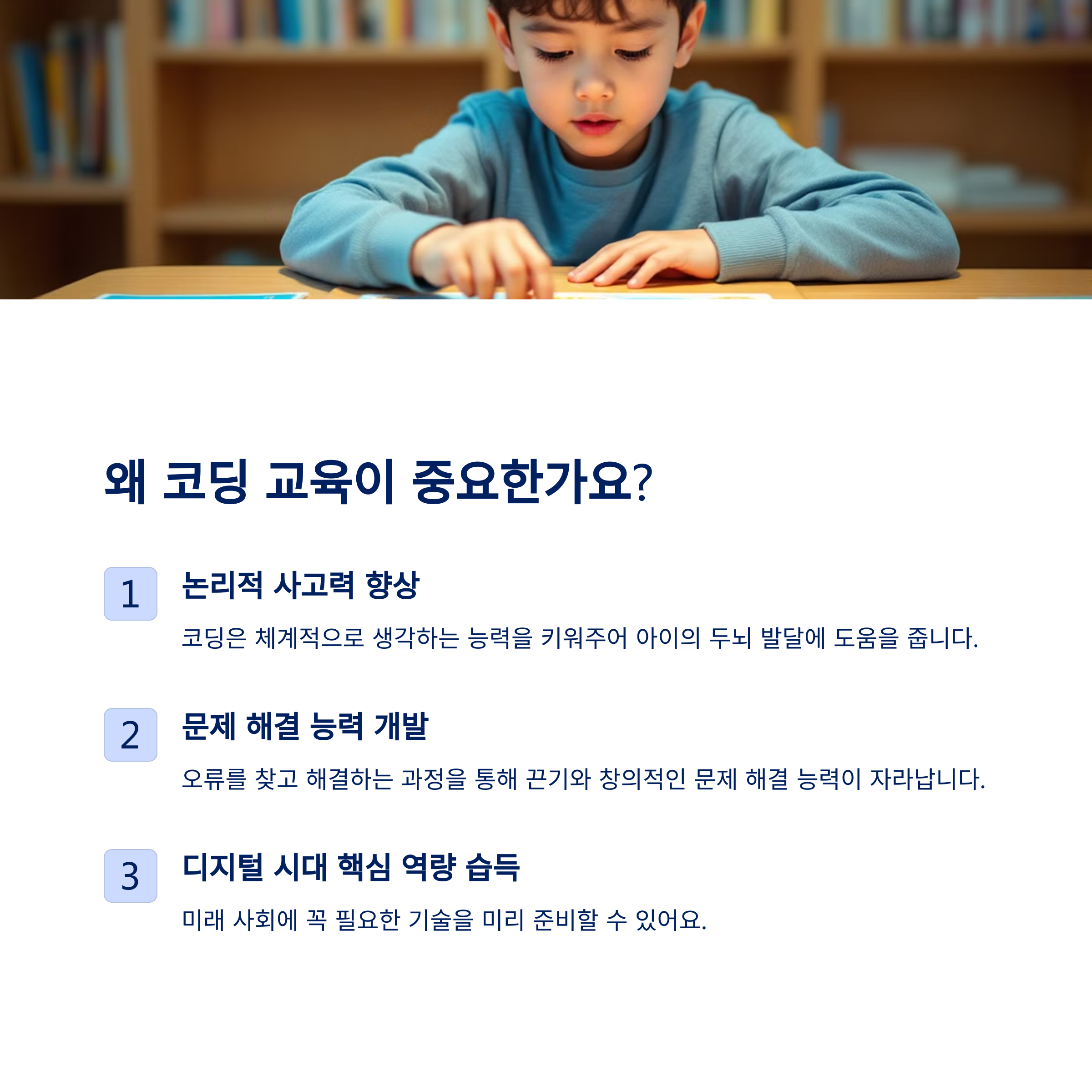 코딩은 단순한 프로그래밍 기술이 아니라 논리적 사고와 창의력을 키우는 중요한 과정입니다. 놀이처럼 접근하고, 아이의 흥미를 유도하면서 재미있게 학습할 수 있도록 도와주세요.