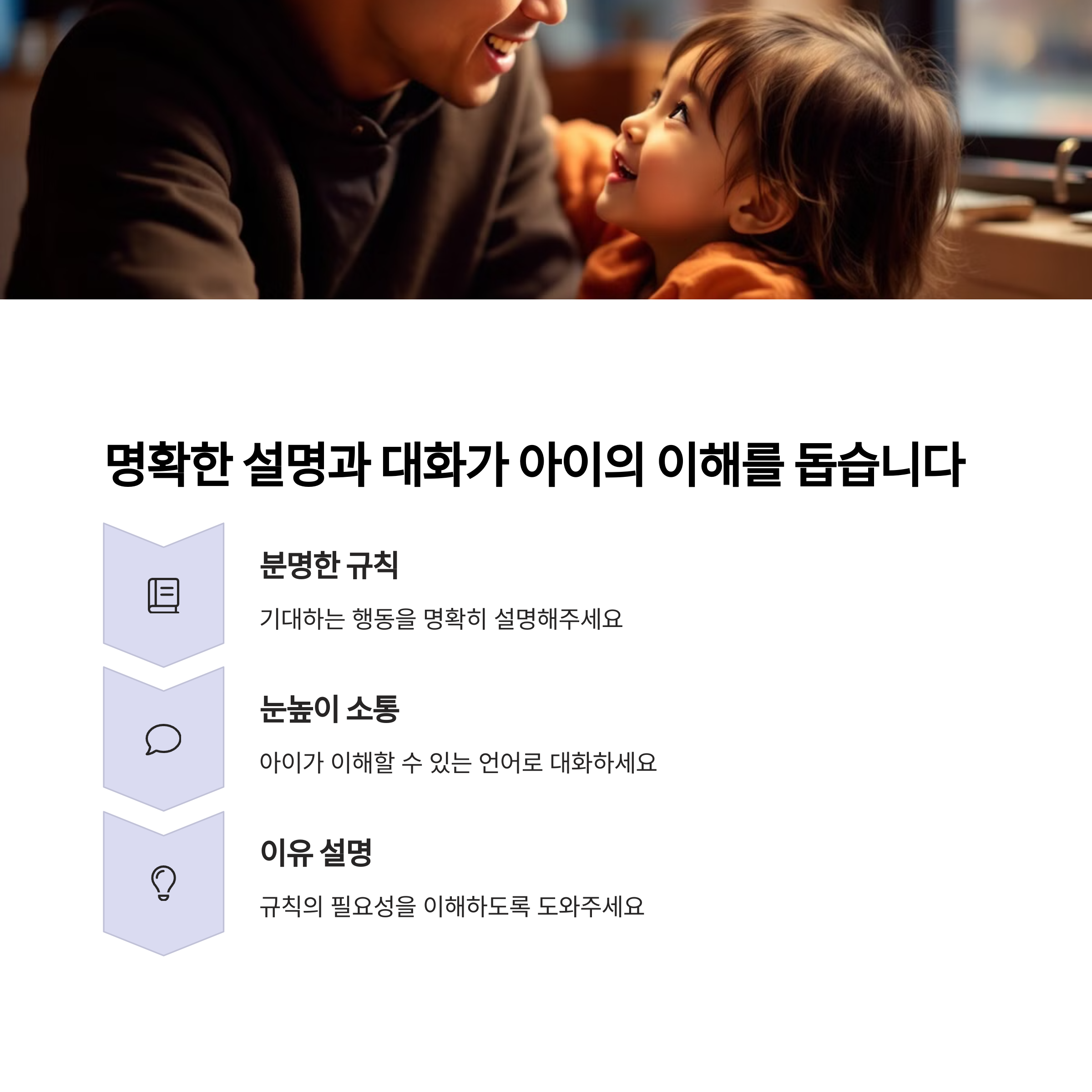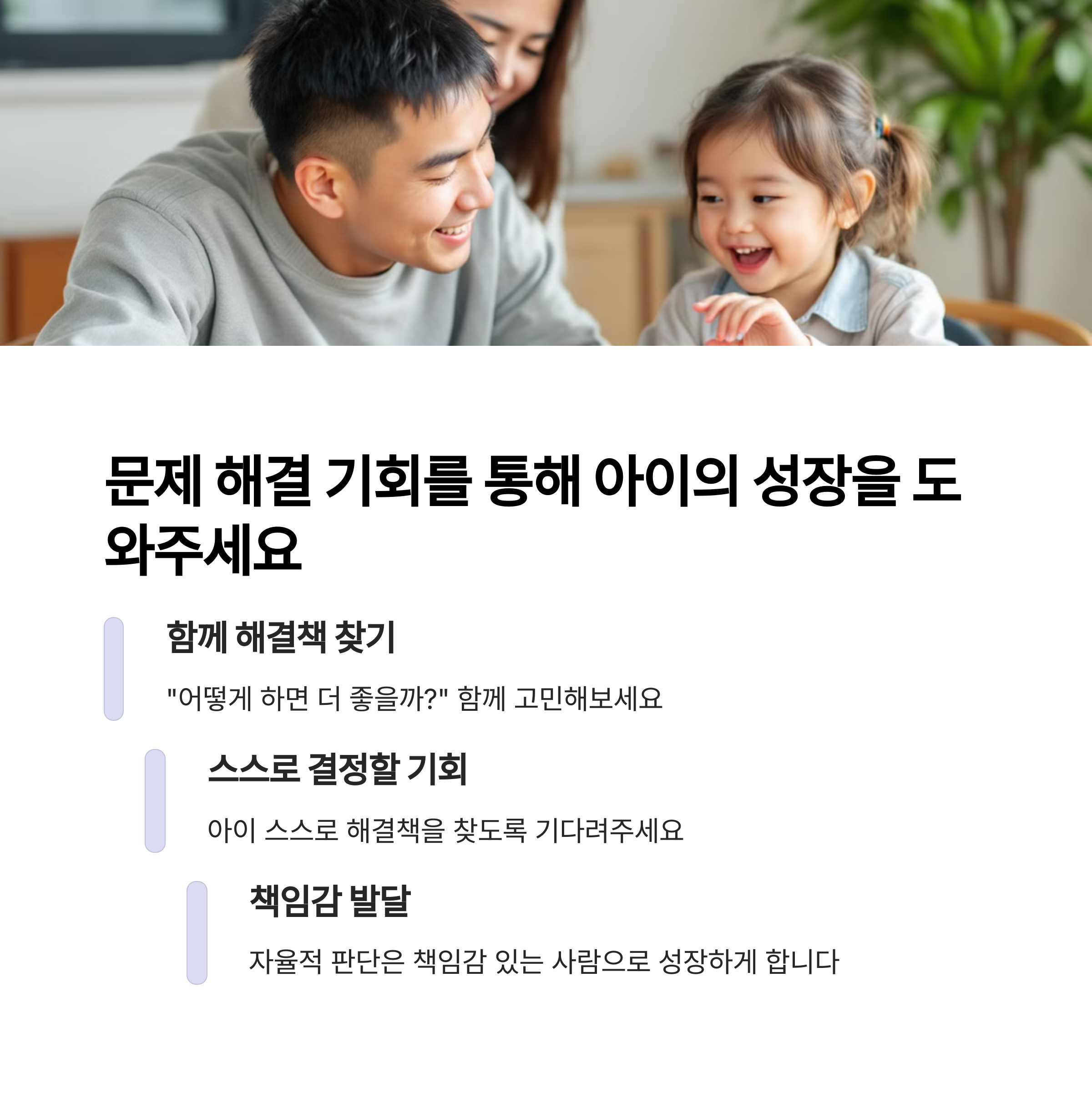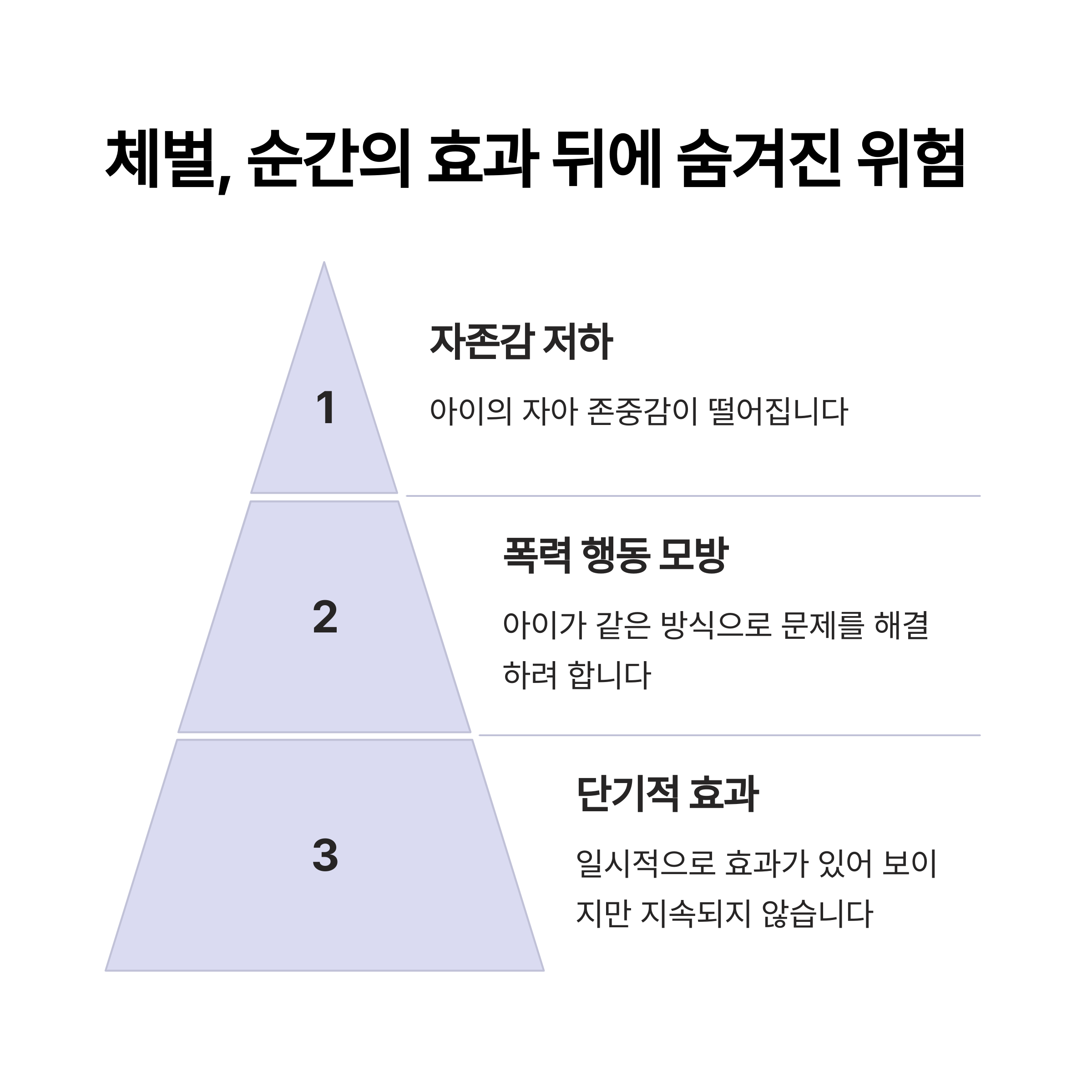 | 부모의 일관된 태도가 중요합니다. | 체벌은 아이의 자존감에 부정적인 영향을 줄 수 있습니다. | 아이가 스스로 문제 해결할 기회를 주는 것이 중요합니다. |