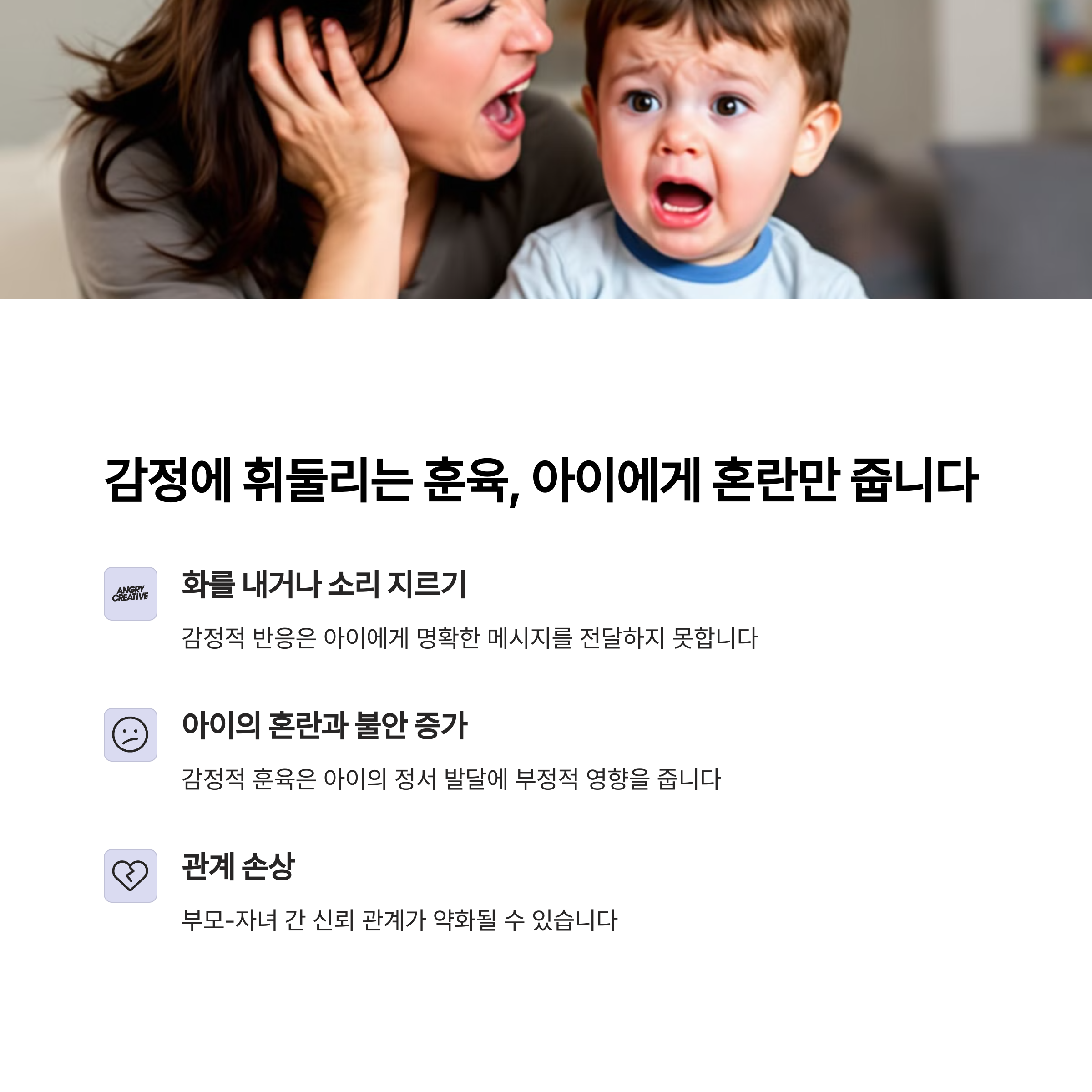 | 감정적인 훈육 | 체벌의 문제점 | 올바른 대안 |