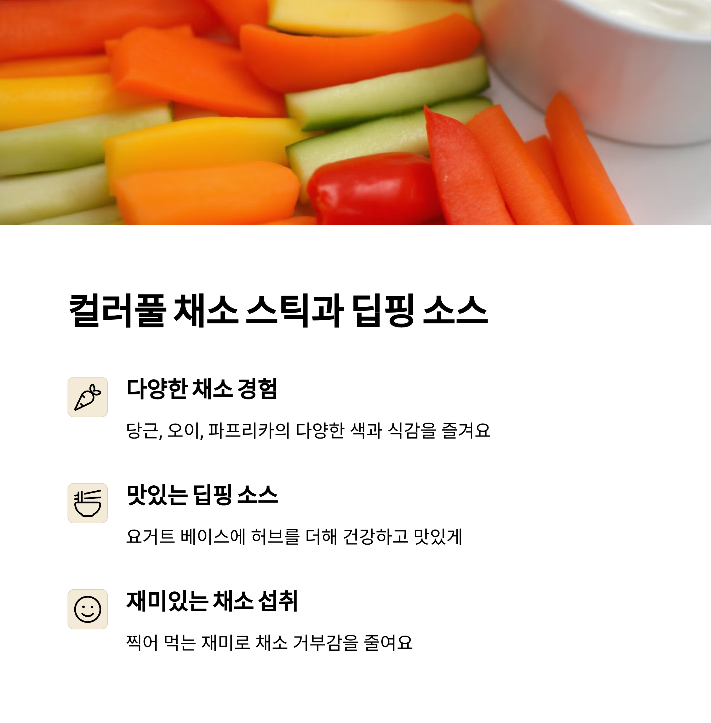 4. 채소 스틱과 홈메이드 딥핑 소스 당근, 오이, 파프리카 등을 요거트 소스에 찍어 먹으면 영양을 균형 있게 채울 수 있습니다. 준비물은 당근, 오이, 파프리카, 플레인 요거트 1컵, 꿀 1작은술, 레몬즙 1작은술입니다. 요거트에 꿀과 레몬즙을 섞어 소스를 만들고, 채소를 스틱 모양으로 썰어 함께 제공하면 완성됩니다.