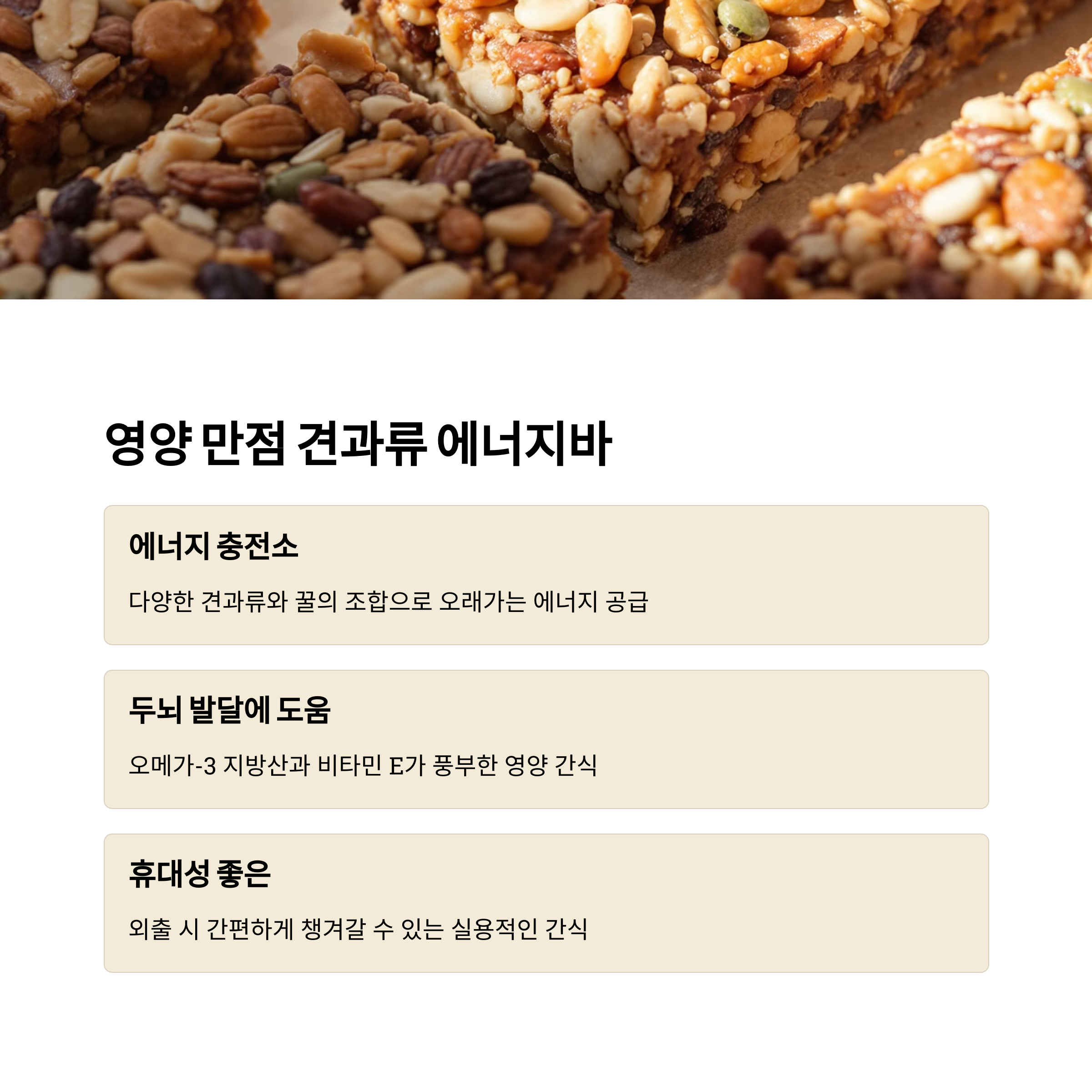 5. 견과류 에너지바 다양한 견과류와 꿀을 이용해 간단히 만들 수 있어 건강한 간식으로 적합합니다. 준비물은 견과류(아몬드, 호두, 땅콩 등) 1컵, 꿀 1/4컵, 오트밀 1컵입니다. 모든 재료를 섞어 오븐에서 160도 20분간 구운 후, 식혀서 자르면 완성됩니다.