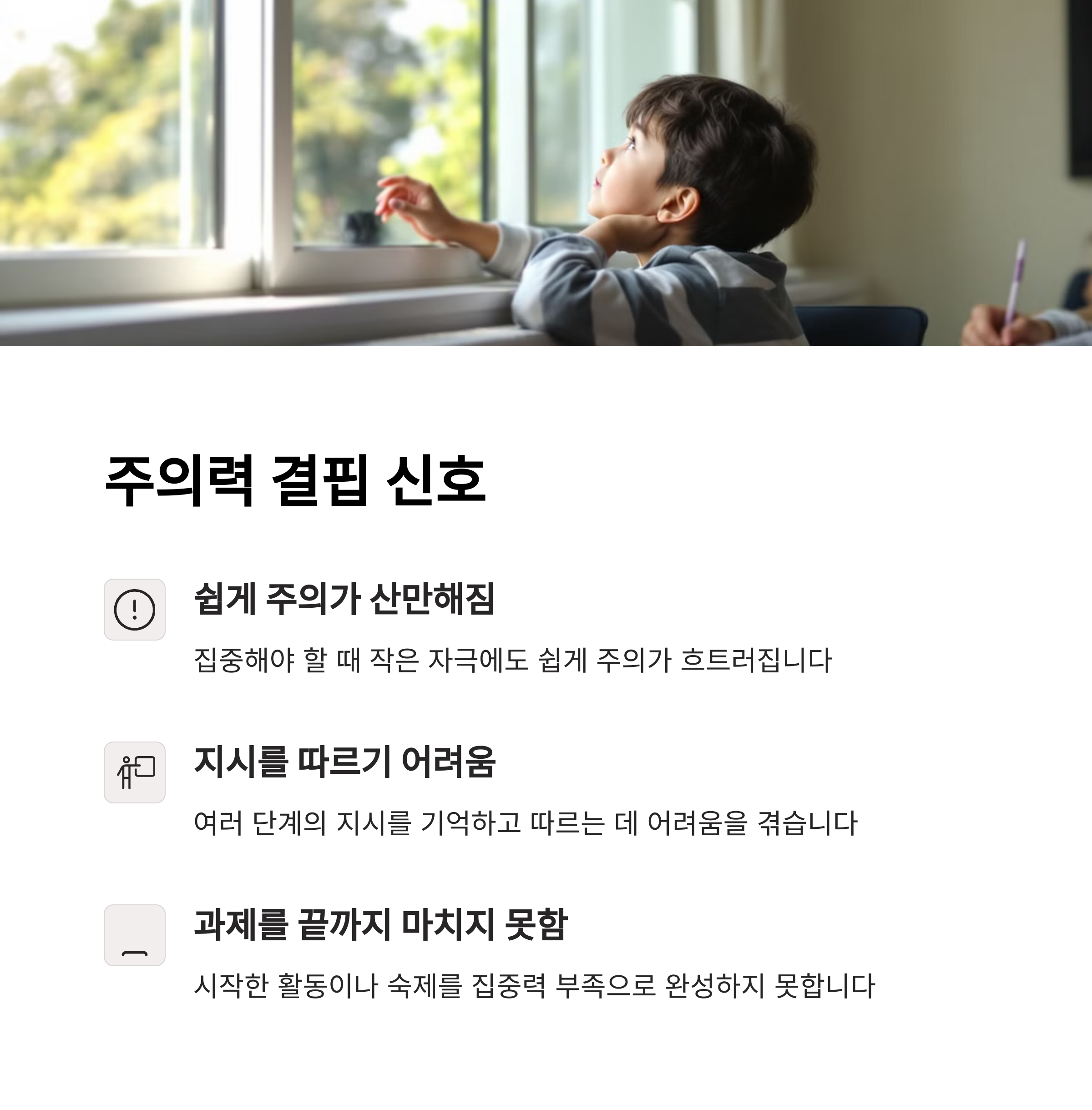 | 집중력 유지 어려움 | 충동적으로 말하거나 행동 | 계속해서 움직이려 함 |