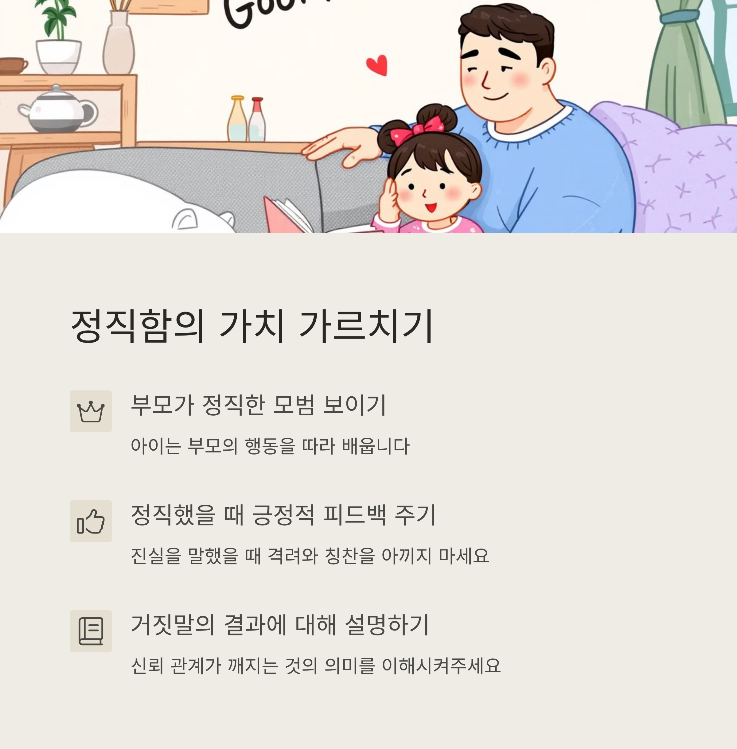 아이가 솔직할 때 긍정적인 피드백을 주는 것이 중요합니다. 거짓말보다는 정직함이 더 좋은 결과를 가져온다는 것을 경험을 통해 배우도록 유도하세요.