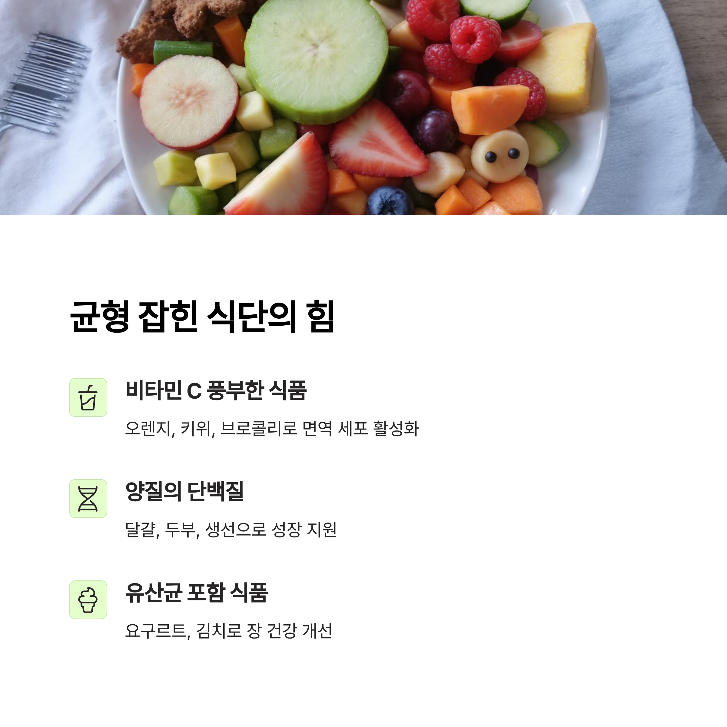 오늘은 부모님들이 실천할 수 있는 면역력 향상 식단과 생활 습관에 대해 구체적으로 알려드릴게요. 우리 아이가 건강하고 활기찬 일상을 보낼 수 있도록, 지금부터 하나씩 체크해보세요.