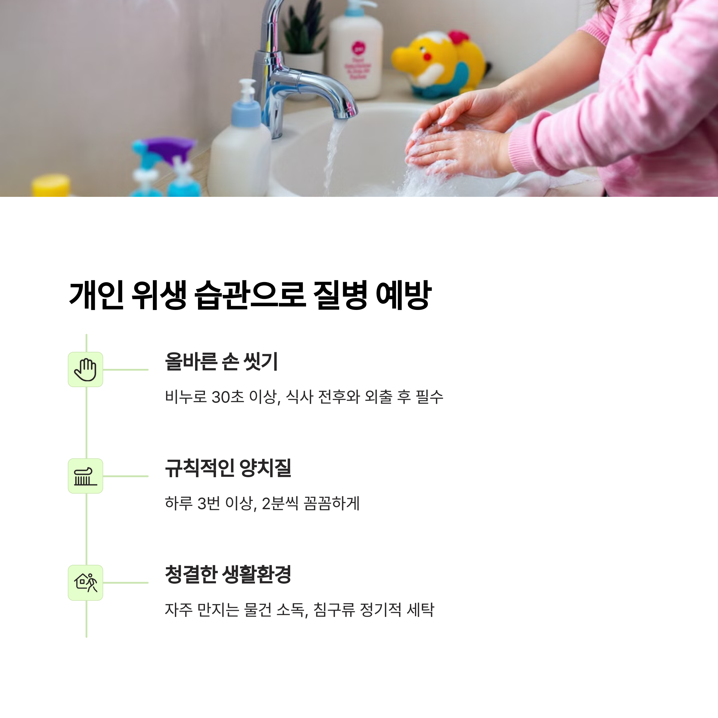 두 번째는 생활 습관입니다. 충분한 수면은 아이의 성장뿐만 아니라 면역력에도 큰 영향을 줍니다. 성장기 아이들은 하루에 최소 9시간 이상의 숙면이 필요합니다. 규칙적인 수면 시간과 취침 전 조용한 환경은 아이의 생체리듬을 안정시켜 줍니다. 또한, 하루 30분 이상 햇빛을 쬐며 바깥 활동을 하는 것도 비타민 D 합성에 도움을 주어 면역 기능을 활성화시켜 줍니다. 실내 활동만으로는 부족할 수 있으므로 산책, 자전거 타기, 놀이터 놀이 등 가벼운 야외 활동을 매일 포함시키는 것이 좋습니다.