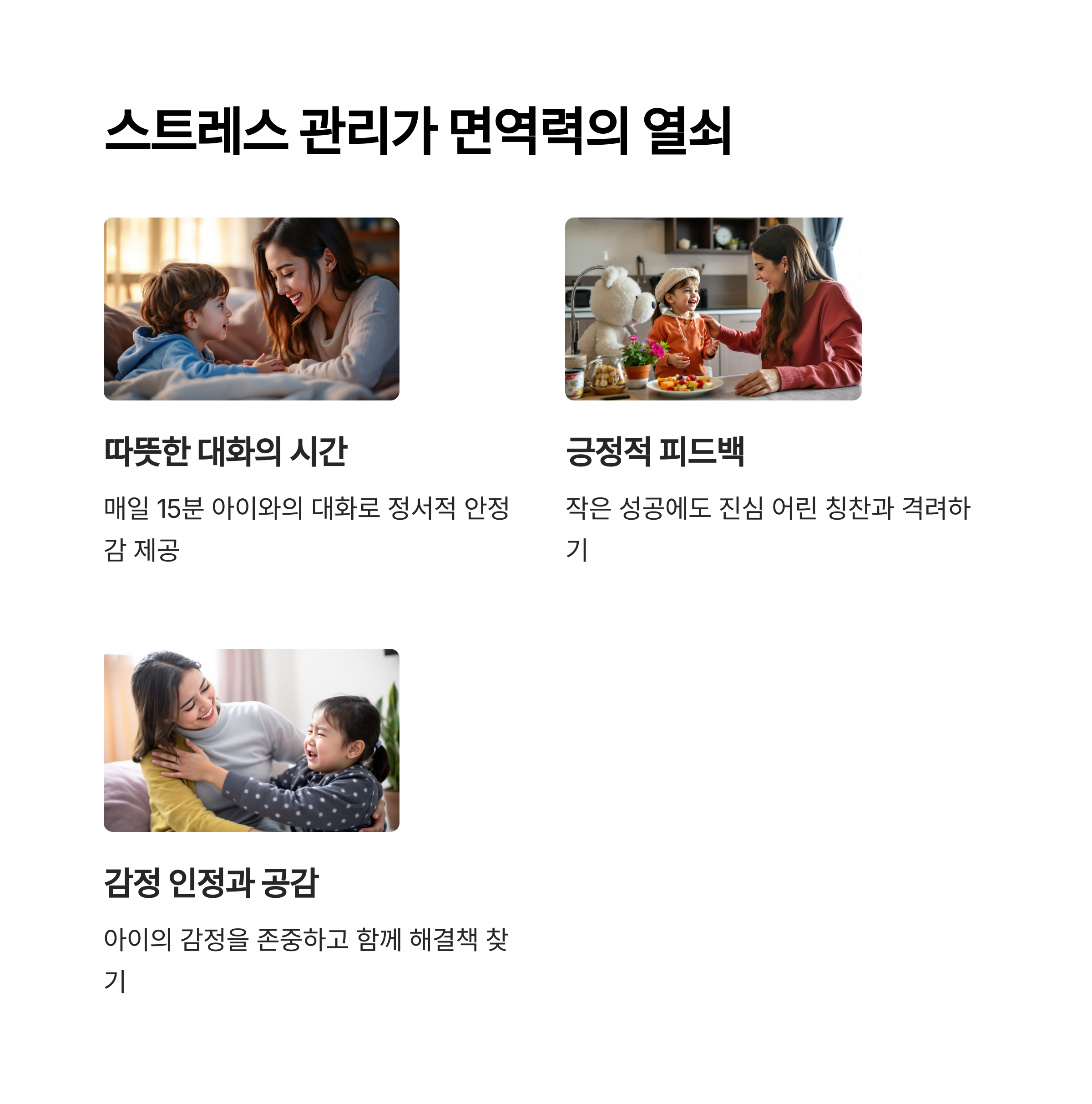 마지막으로 스트레스 관리도 빼놓을 수 없습니다. 아이들도 다양한 이유로 스트레스를 받습니다. 과도한 학습, 부모의 잦은 잔소리, 친구들과의 관계 등은 아이의 정서에 큰 영향을 줄 수 있으며, 이는 곧 면역력 저하로 이어지기도 합니다. 아이의 감정을 잘 살피고, 대화를 통해 정서적인 안정감을 주는 것이 필요합니다. 하루 10분이라도 아이와 눈을 맞추며 이야기 나누는 시간은 단순한 대화 이상의 가치를 만들어 줍니다. 감정이 건강해야 몸도 건강해집니다.