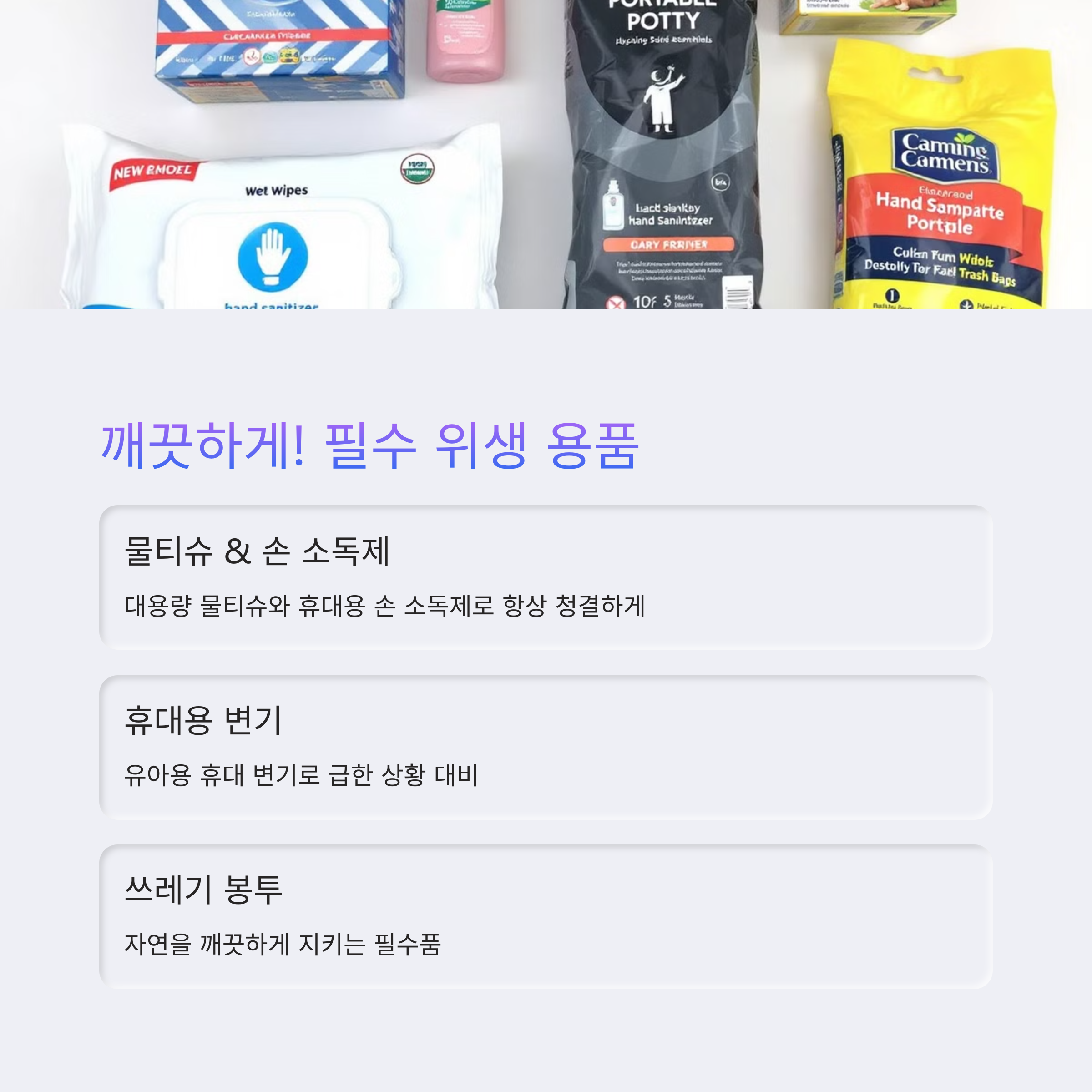 아이가 익숙한 장난감이나 베개 손 세정제, 물티슈, 위생 키트 별자리 책, 손전등, 캠핑 체험 카드