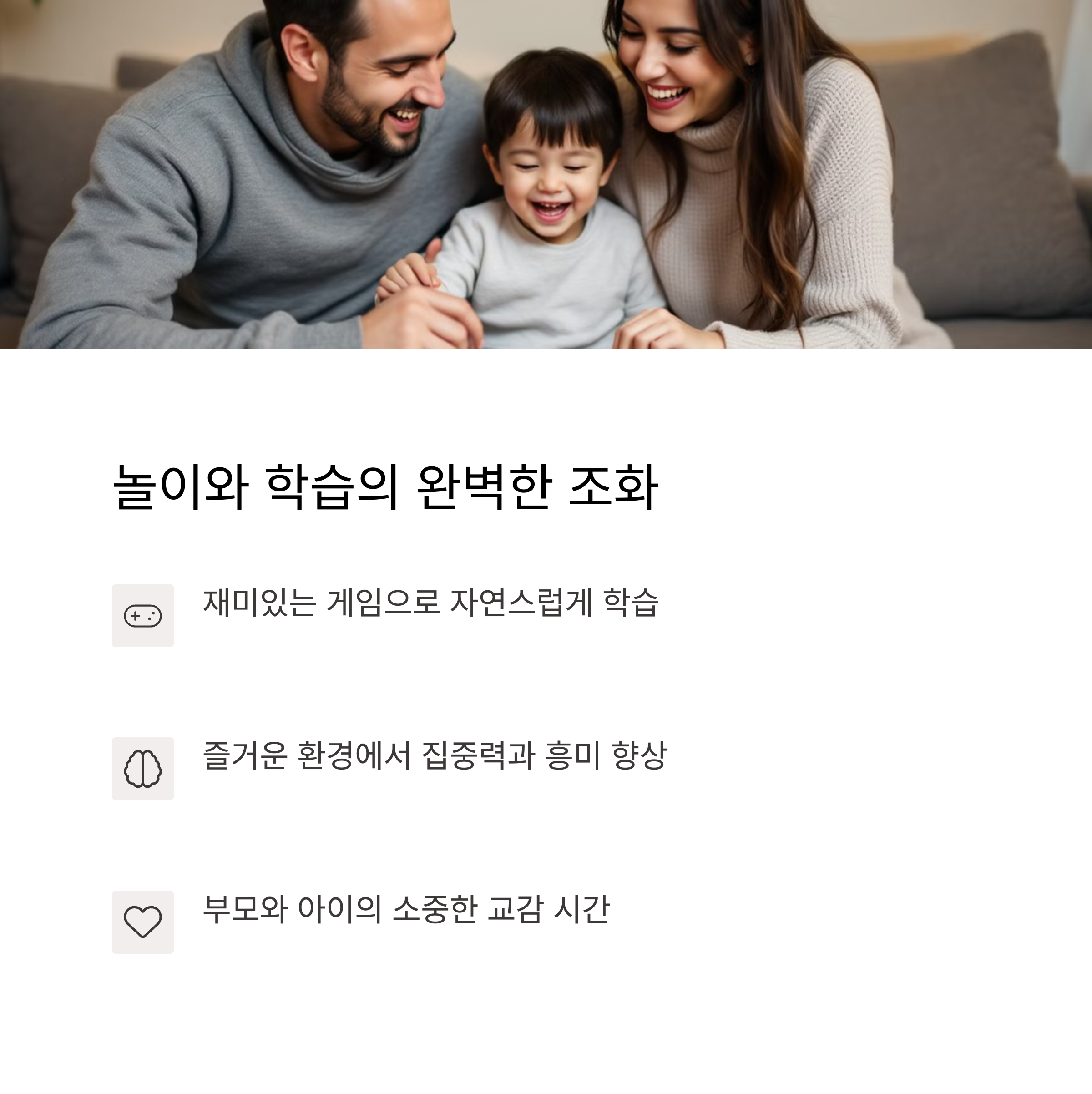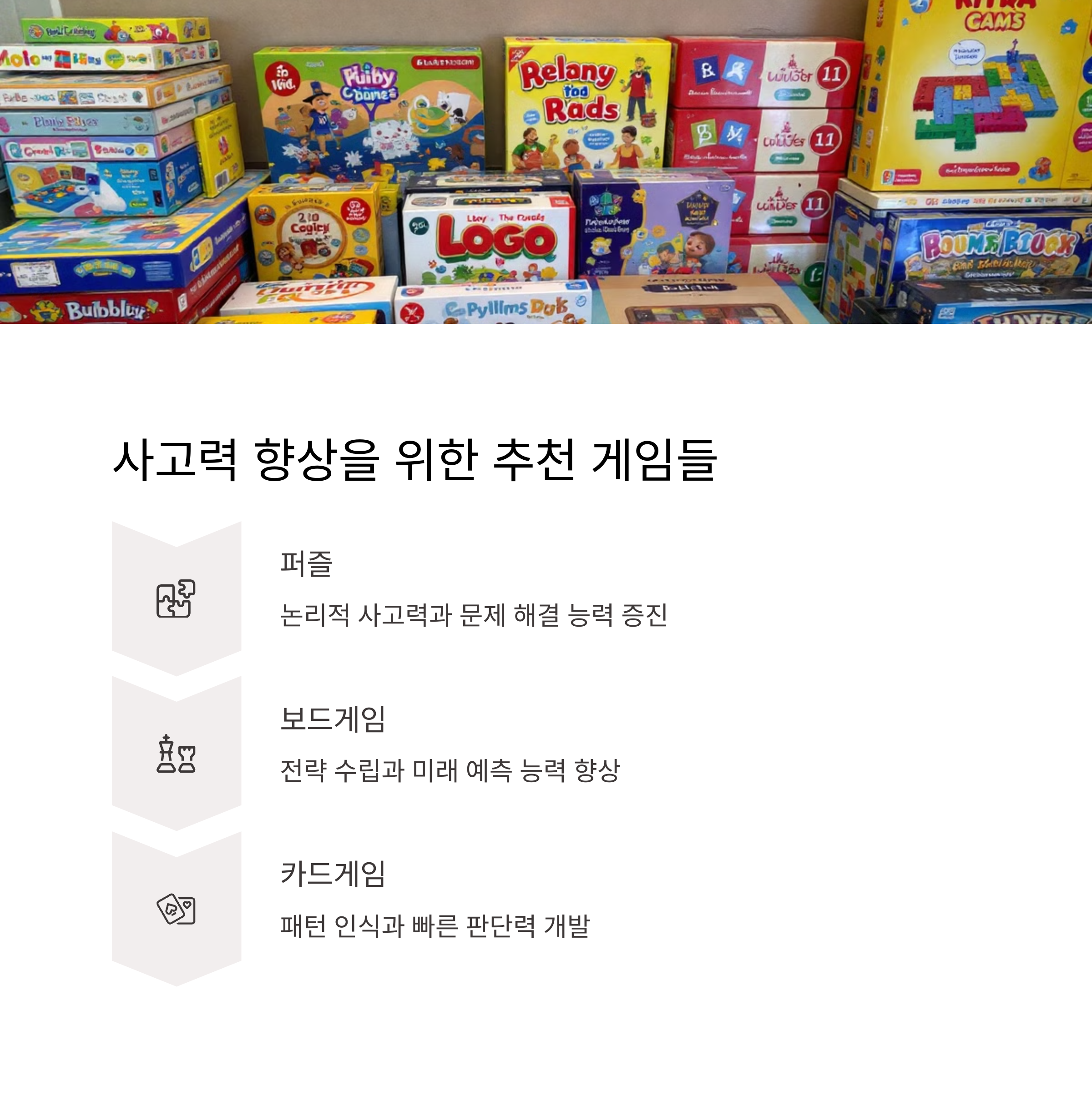 | 사고력, 판단력, 논리적 사고력 향상에 효과적입니다. | 게임을 통한 반복적 몰입은 인지 발달을 자극합니다. | 다양한 감정을 구분하고 스스로 조절할 수 있게 됩니다. |