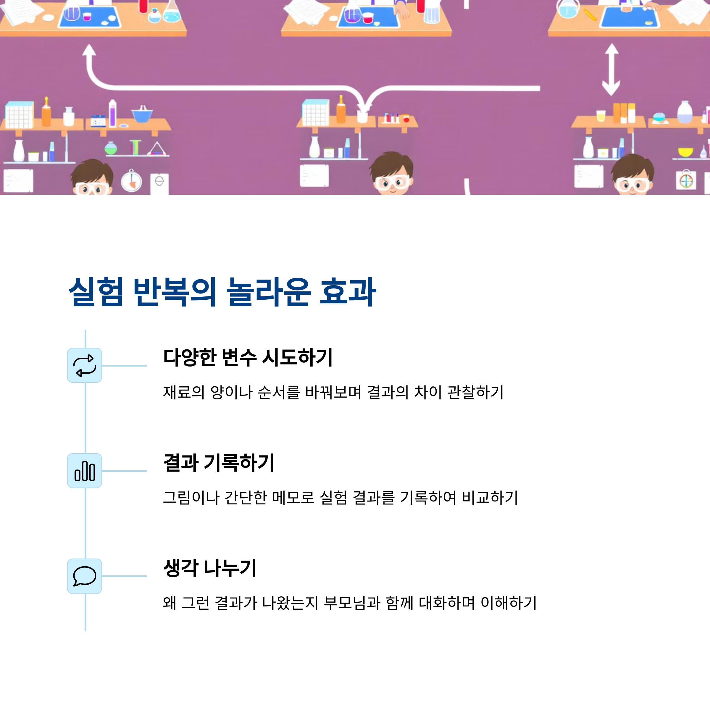 | 다양한 결과를 예측하고 새롭게 시도하는 힘을 길러줌 | 집에서도 쉽게 준비물로 체험 가능한 놀이 구성 | 실험 중심 활동으로 아이의 집중력과 흥미 유도 |