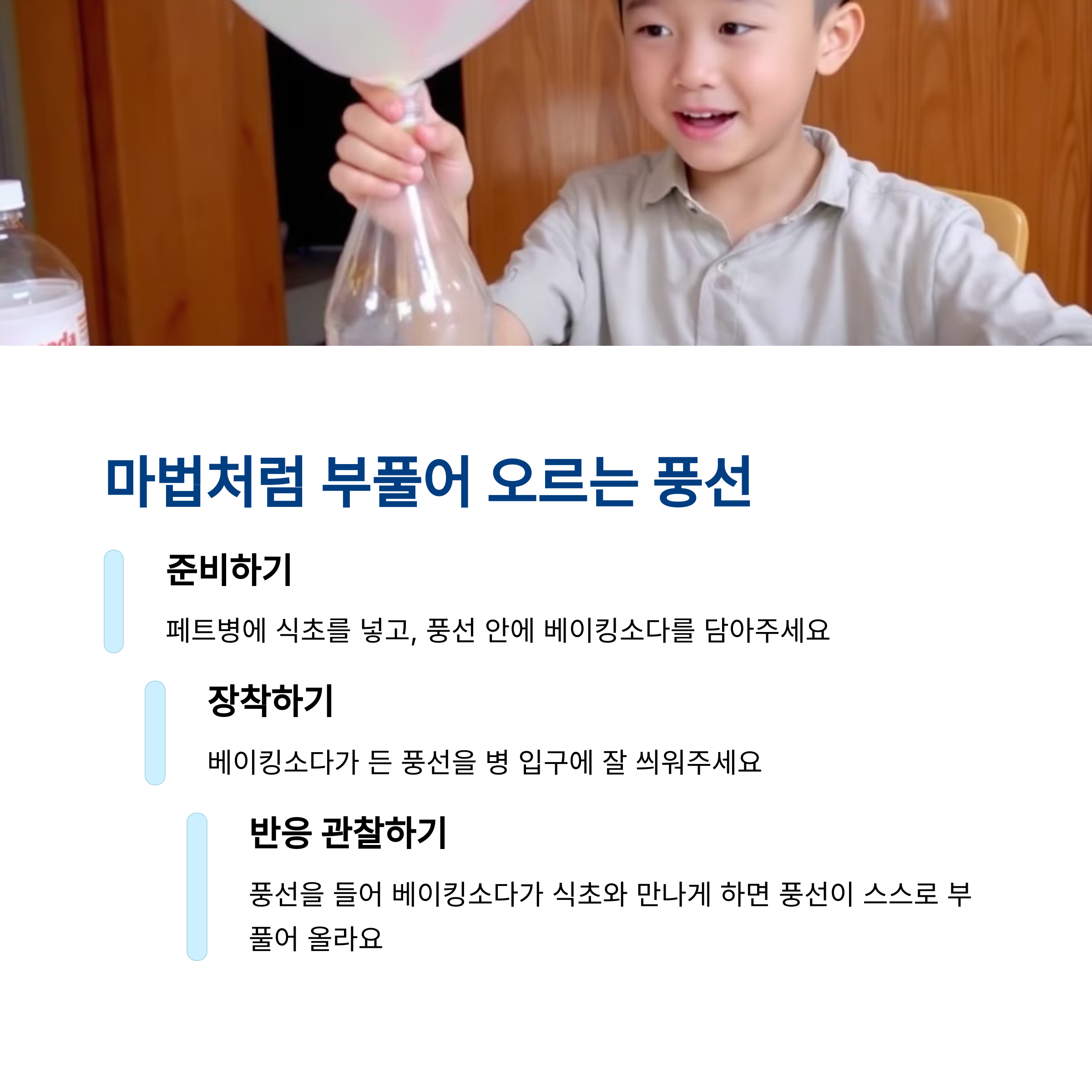 마지막으로 소개할 실험은 '풍선 자가 팽창 실험'입니다. 플라스틱 병에 베이킹소다를 넣고, 풍선에 식초를 담아 병 입구에 씌운 뒤 풍선을 들어 식초를 떨어뜨리면 이산화탄소가 발생하면서 풍선이 부풀어 오르는 원리입니다. 기체 발생과 압력 변화를 동시에 체험할 수 있어 매우 인상적인 실험이며, 아이들은 이 과정에서 예상 → 실험 → 결과의 과정을 자연스럽게 습득하게 됩니다. 실험 중 관찰한 내용을 말로 표현하도록 유도하면 언어 능력 향상에도 도움을 줄 수 있습니다. 이런 실험을 반복적으로 진행하면서 아이는 자신도 모르게 과학적 사고 틀을 갖추게 됩니다.