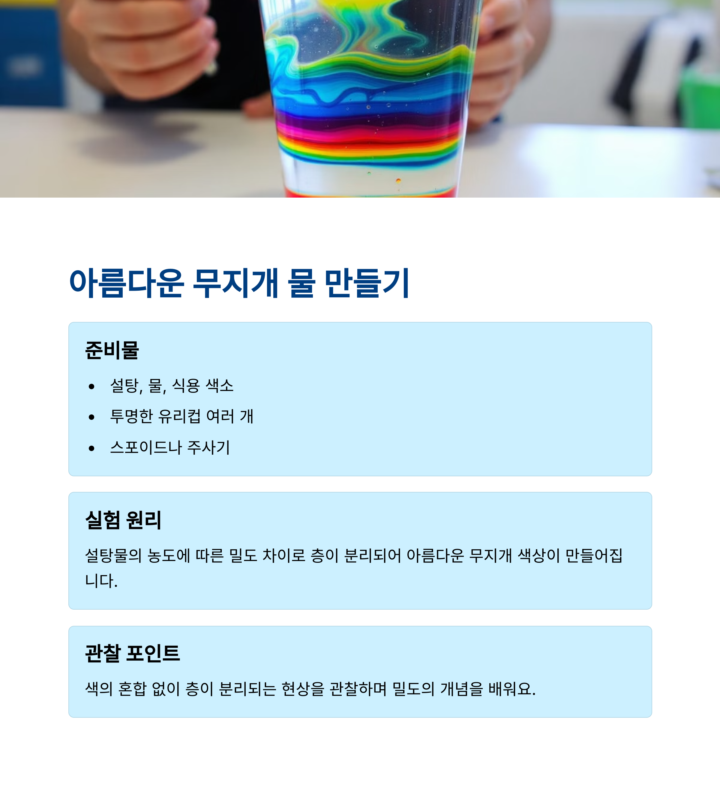 또 하나 추천하고 싶은 실험은 '무지개 물 실험'입니다. 설탕물의 농도를 다르게 만들어 층층이 색이 다른 물을 병에 담아보는 간단한 실험이지만, 밀도라는 과학 개념을 시각적으로 매우 쉽게 이해할 수 있게 해주는 활동입니다. 색소의 배합, 액체의 양 조절 등 과정 하나하나에서 아이들은 섬세함과 집중력을 요하게 되며, 실패했을 경우 다시 시도해보며 원인을 찾는 태도도 자연스럽게 습득하게 됩니다. 과학은 결과보다 과정이 더 중요하다는 것을 몸소 느끼게 해주는 최고의 실험 중 하나입니다. 놀이처럼 진행되지만 실제 사고력 훈련으로 이어지는 대표적인 사례라 할 수 있습니다.