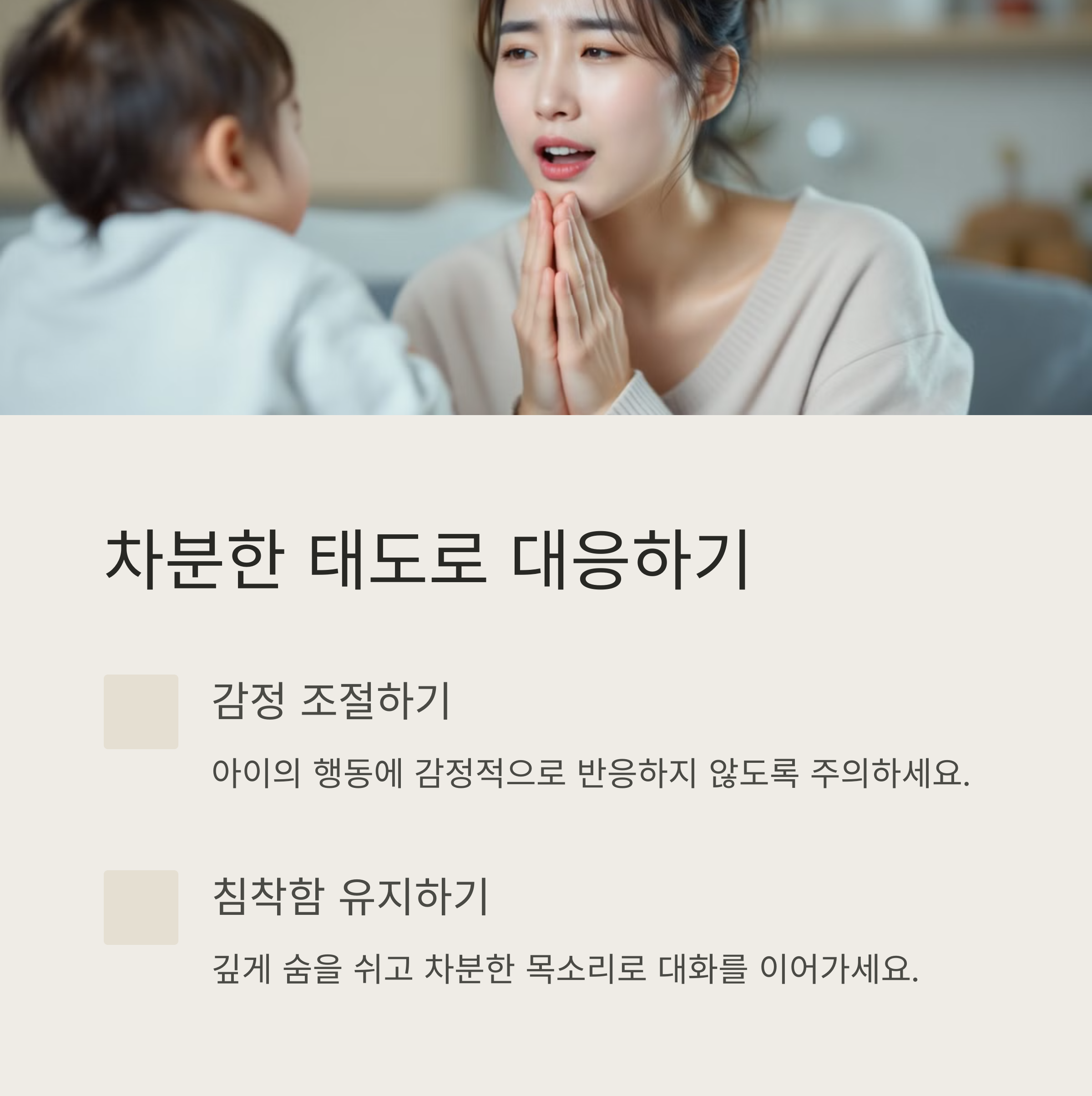 부모의 태도 단호하지만 차분한 태도가 중요해요.