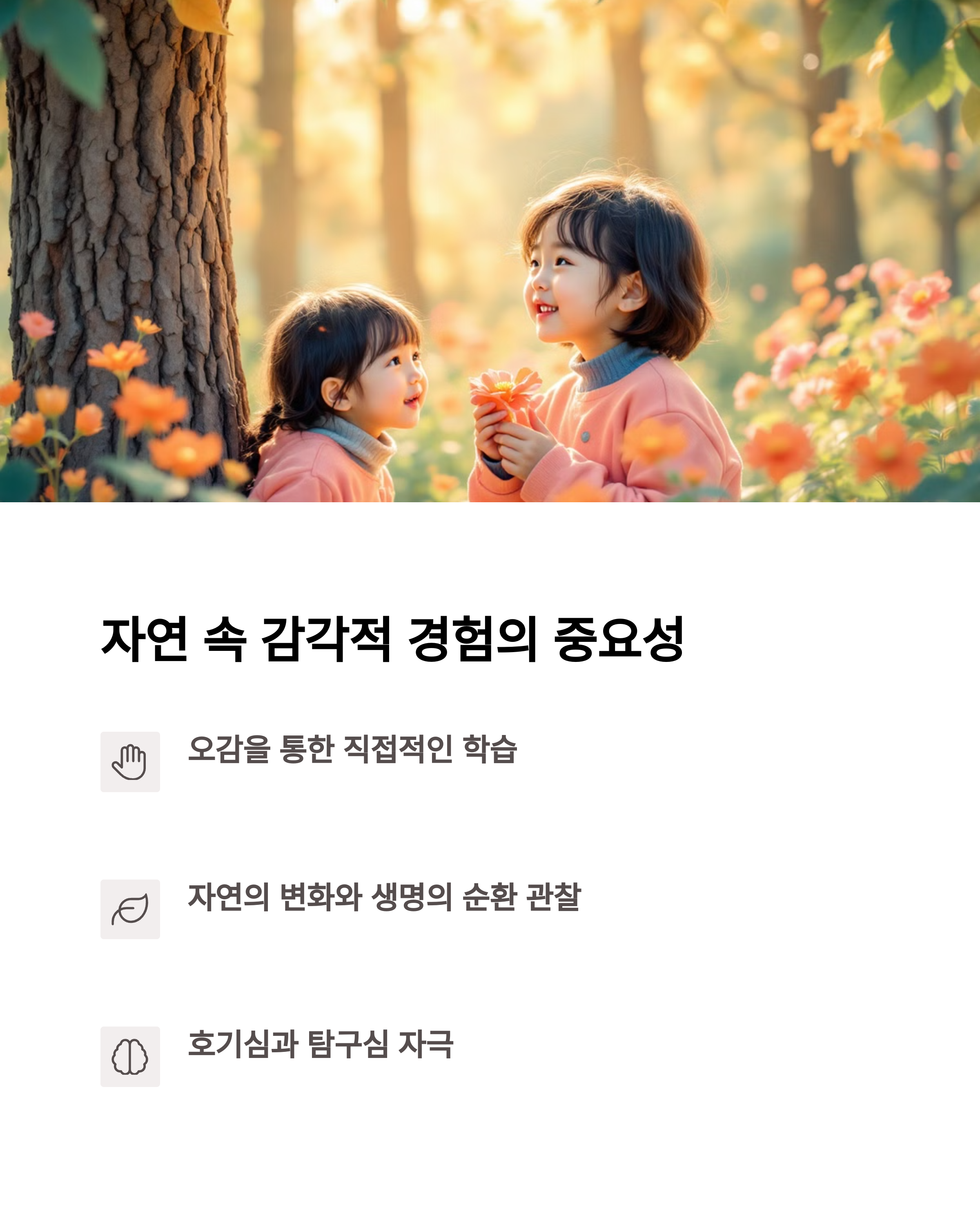| 자연 속에서 배우는 생명의 소중함 | 계절 따라 느끼는 환경 변화 | 감각 자극을 통한 두뇌 성장 |