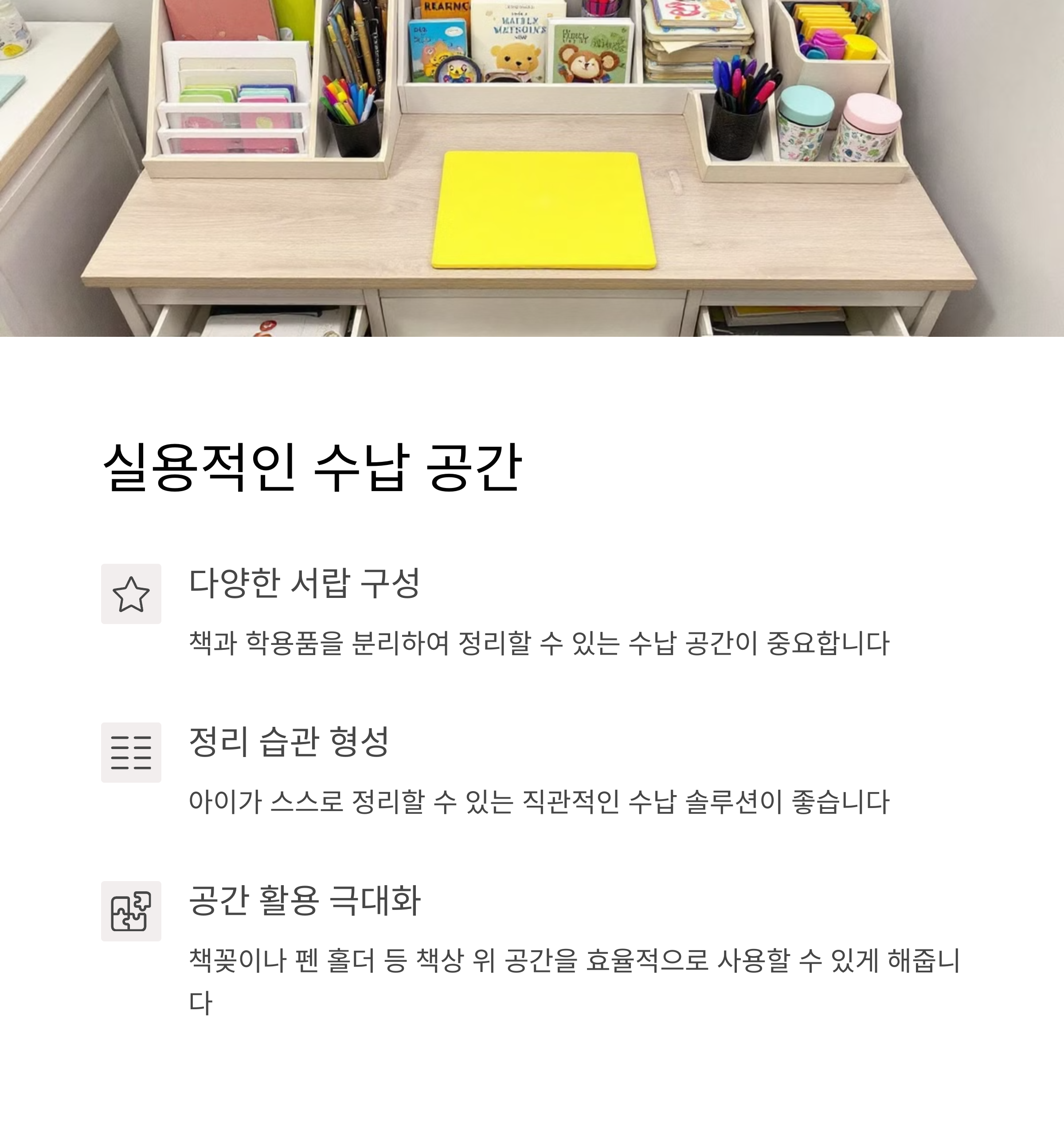 기능도 중요하지만, 아이가 스스로 공부하고 싶어지도록 유도하려면 ‘마음에 드는 공간’을 만들어주는 것이 포인트!