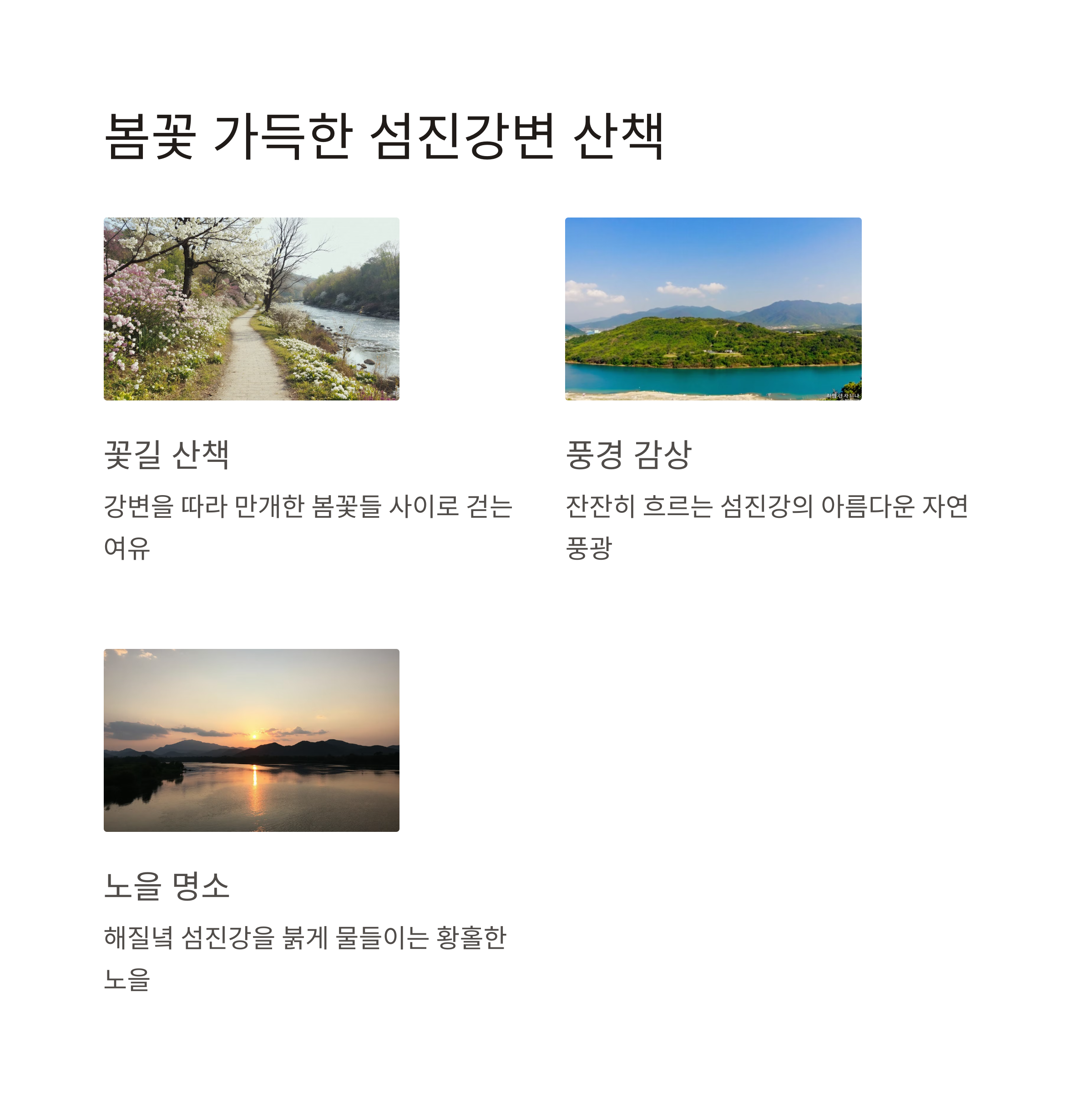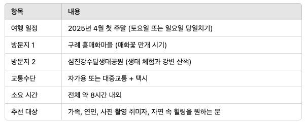구례의 봄은 짧지만 강렬합니다. 흥매화마을의 만개한 매화와 섬진강의 청량한 자연을 하루에 담아보는 이 코스는 분명 오랫동안 기억에 남을 봄 여행이 될 것입니다. 당일치기 코스로도 부담 없이 다녀올 수 있어 많은 분들께 추천드리고 싶습니다.