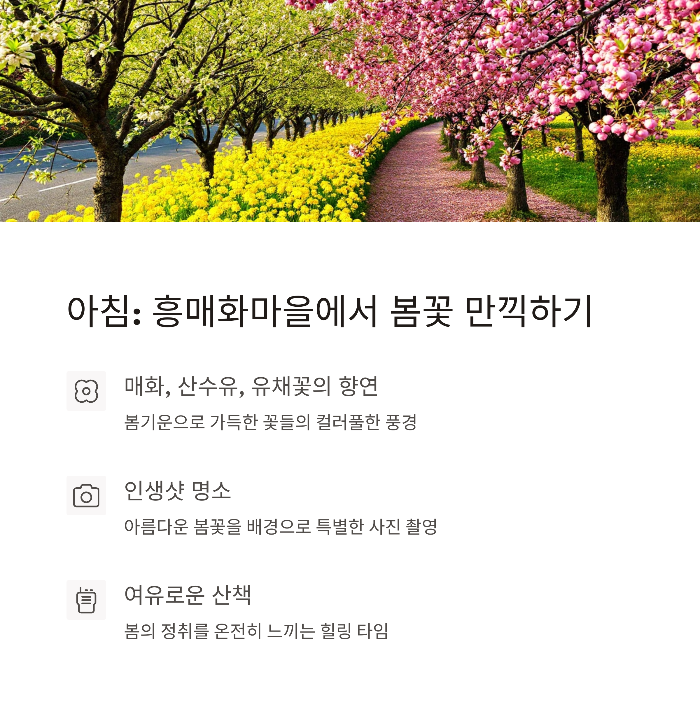 사진 찍는 분들, 아이와 함께하는 가족, 여유로운 데이트를 원하는 커플까지 모두 만족할 수 있는 일정으로, 2025년 봄의 첫 여행지로 딱 어울립니다. 일상의 바쁨에서 벗어나 자연 속에서 느긋한 하루를 보내보세요.