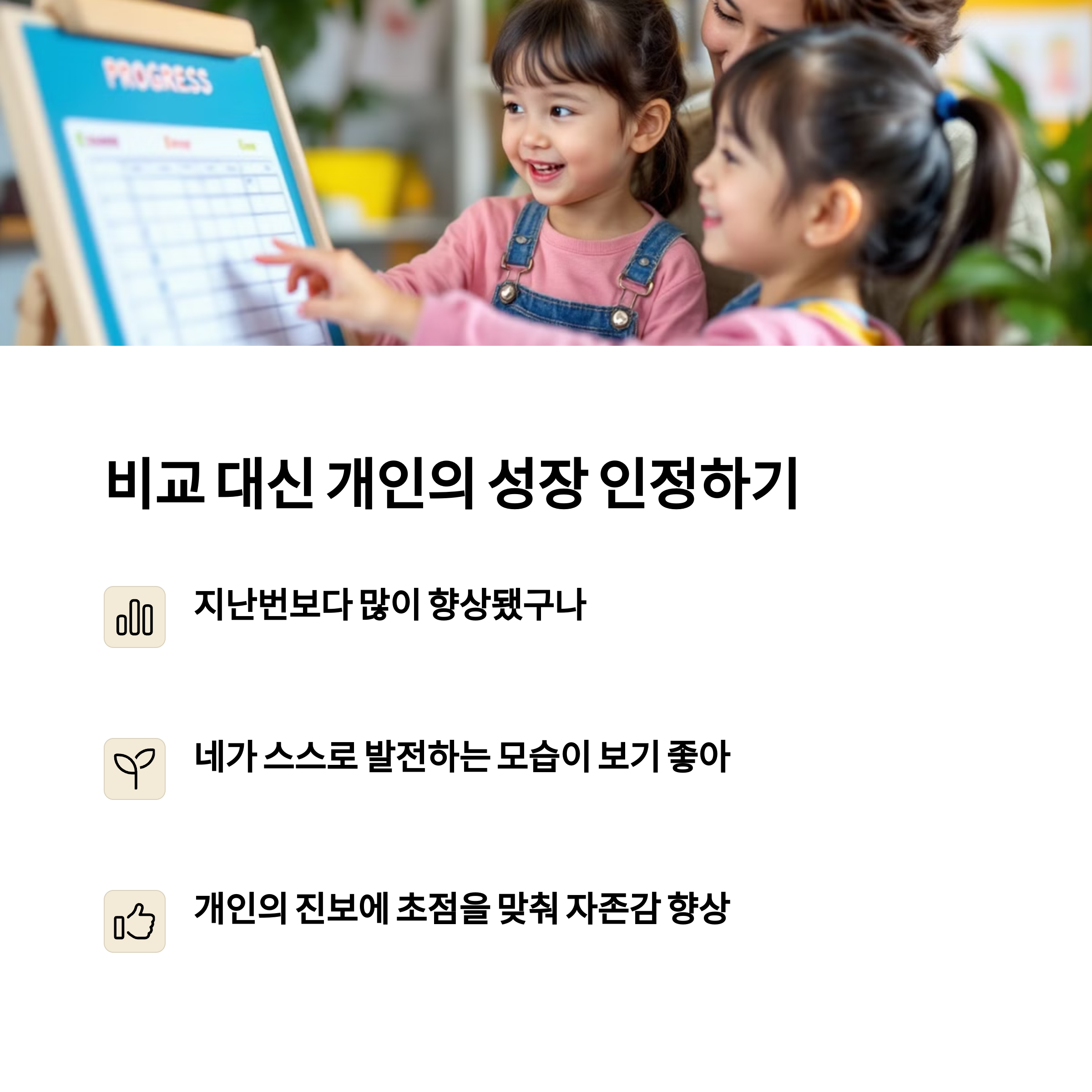 성장은 경쟁이 아니라 변화의 기록입니다. 아이가 스스로 변화의 주인공임을 느끼게 해주는 것이 부모의 언어가 해야 할 역할입니다.