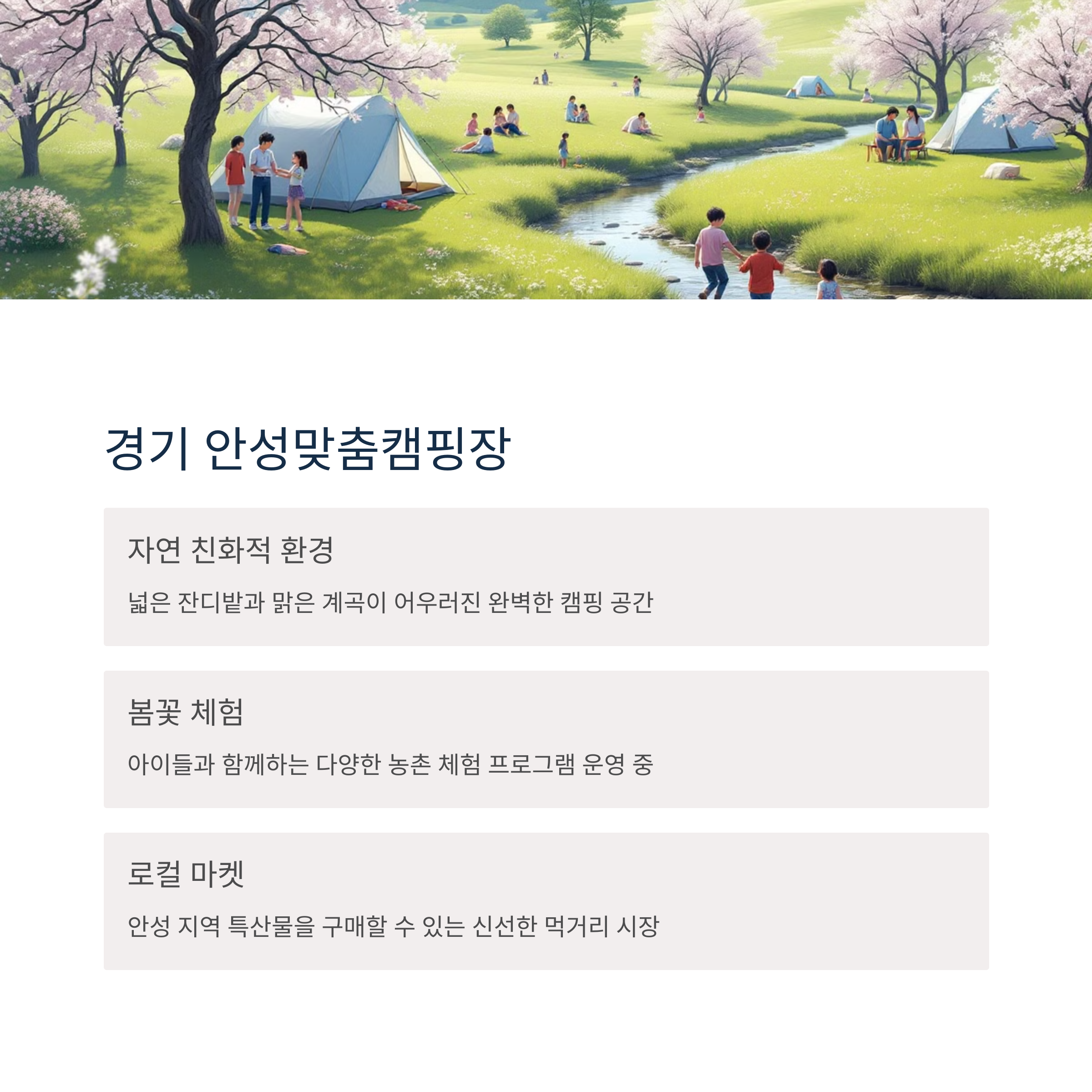 | 안성맞춤캠핑장 | 경기 안성 | 체험형 프로그램, 자연학습 | 유아~초등학생 |