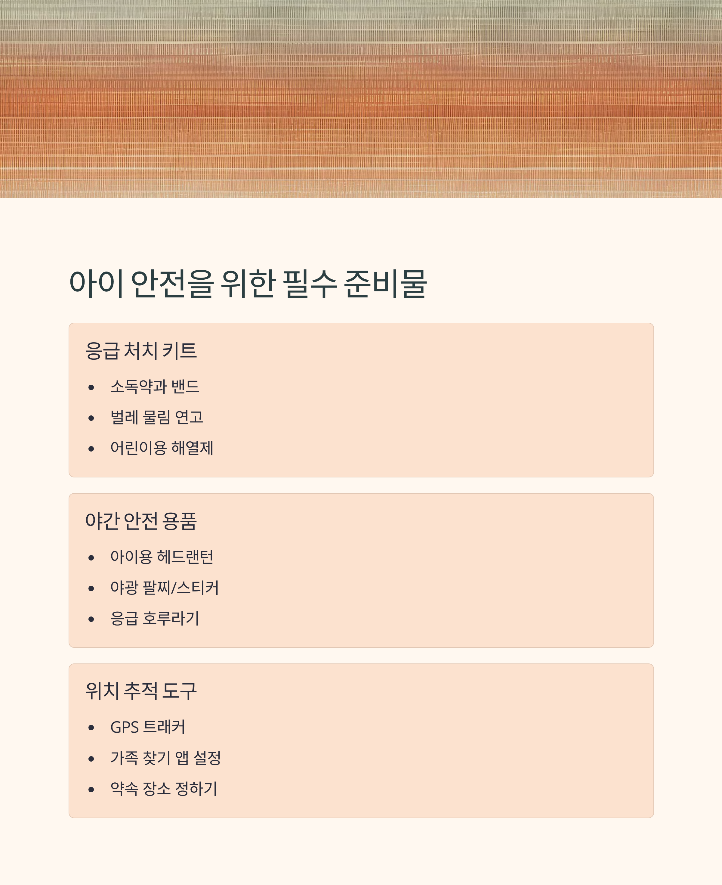 세 번째는 안전과 환경 변화에 대한 준비입니다. 아이는 성인보다 온도 변화에 민감하기 때문에, 봄이나 가을철에는 보온에 특히 신경 써야 합니다. 두꺼운 외투, 여벌 옷, 보온성 침낭 등을 꼭 챙기세요.