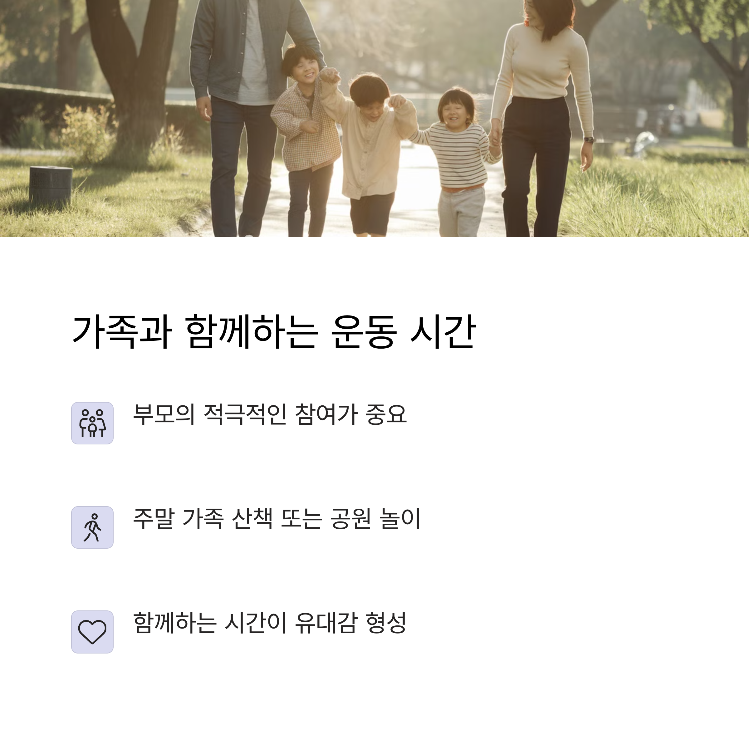 운동을 함께하는 그 시간은 아이에게는 건강뿐 아니라 정서적 안정, 가족 간 신뢰감까지도 심어주는 소중한 시간이 됩니다. 오늘 소개한 팁들을 실생활에 적용해보며, 아이와의 소중한 추억을 만들어보시기 바랍니다.