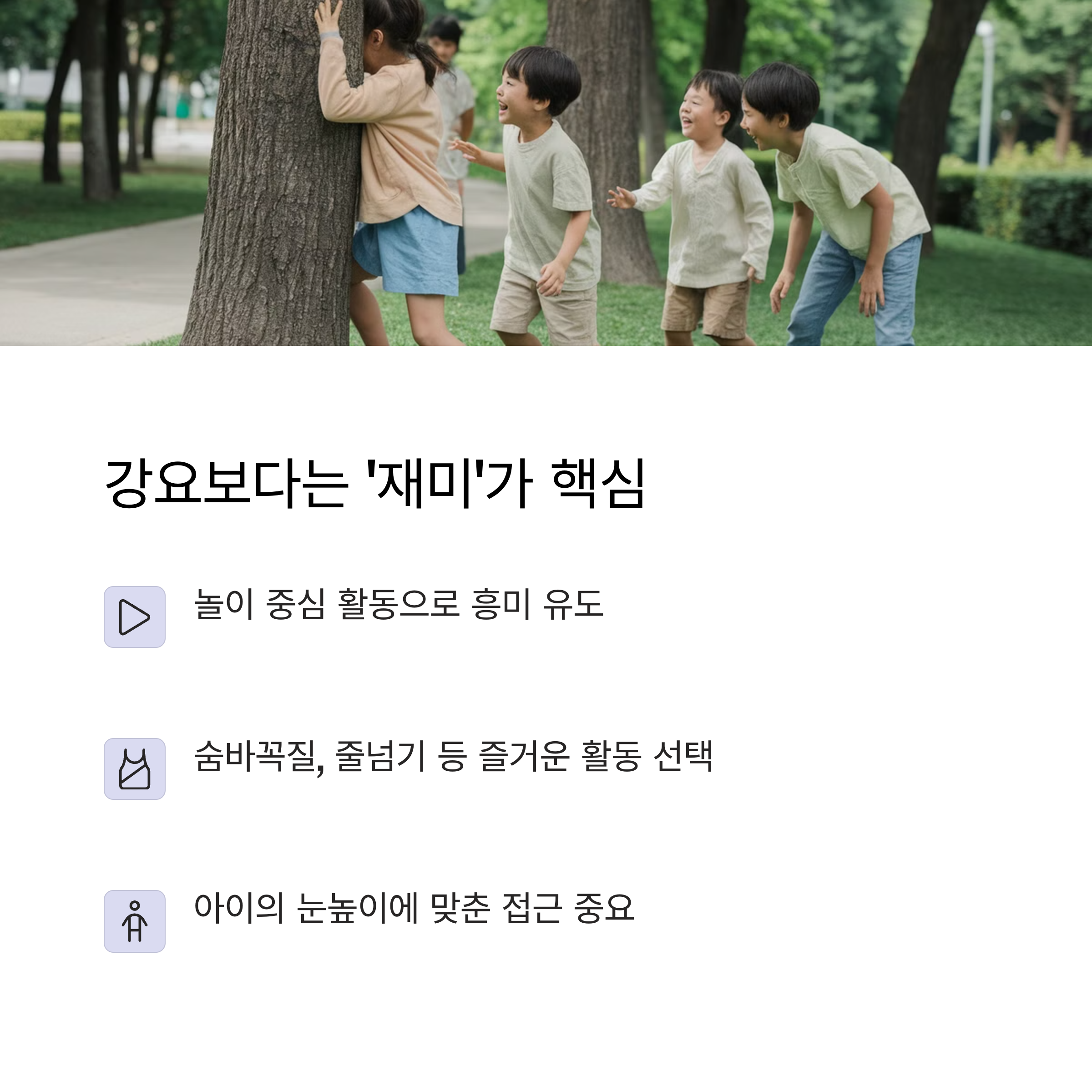 예를 들어 숨바꼭질, 줄넘기, 풍선 배구처럼 간단하면서도 아이의 흥미를 자극하는 활동부터 시작해보세요. 이러한 놀이형 운동은 아이에게 재미와 성취감을 동시에 안겨주며, 반복적으로 하고 싶은 마음을 자극합니다.
