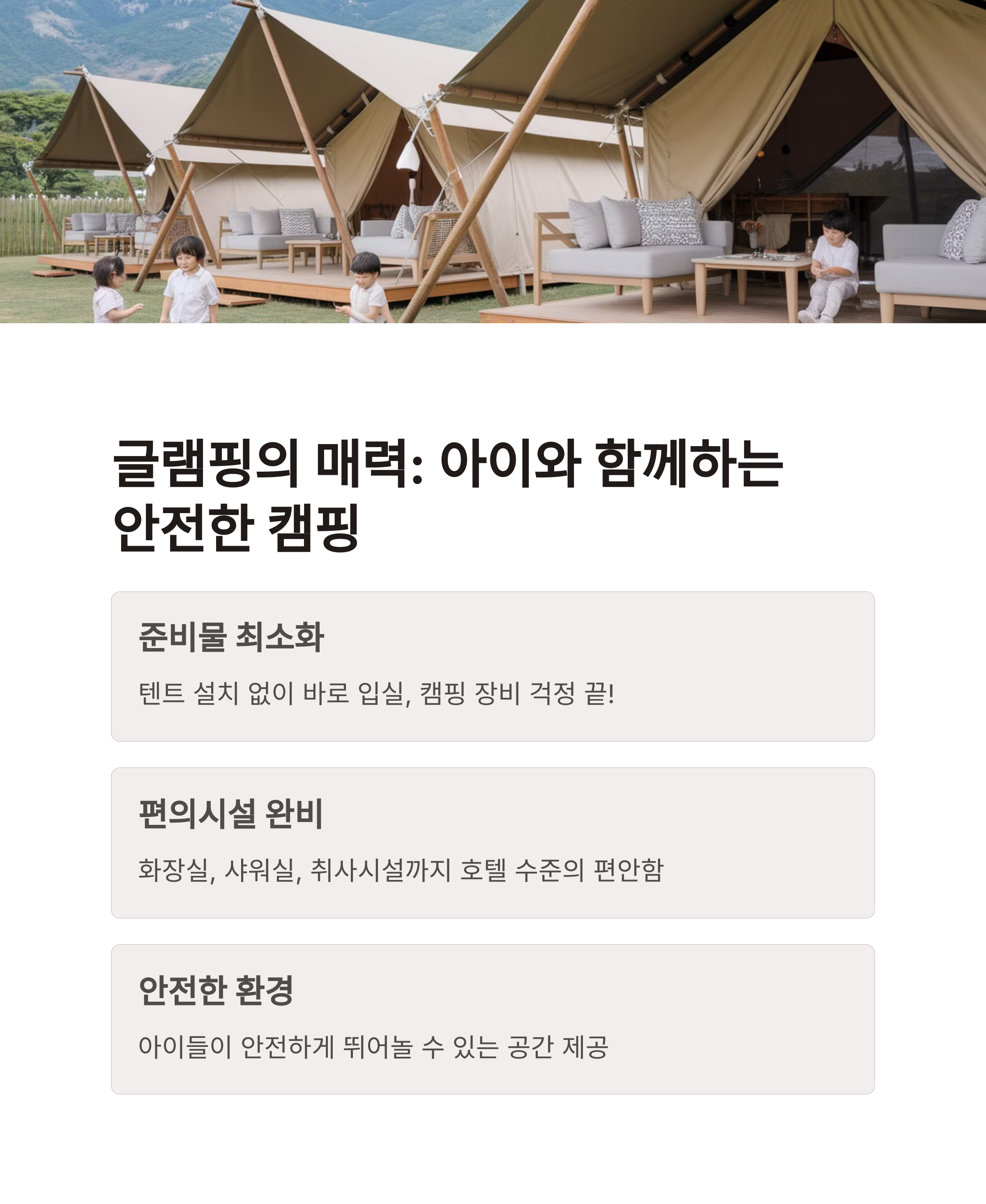 가족 캠핑에서 가장 중요한 요소는 ‘균형’입니다. 부모는 준비와 안전을 책임지고, 아이는 자유롭게 뛰놀며 추억을 쌓아야 합니다. 이런 면에서 글램핑은 가장 안정적인 선택지라 할 수 있으며, 캠핑 입문자나 어린 자녀를 둔 가정에는 이상적인 형태입니다.