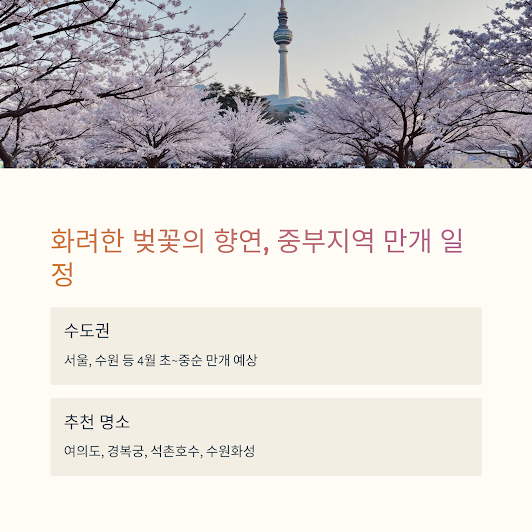 정리: 서울, 수원 등 수도권 지역은 이번 주말부터 개화를 시작해 다음 주~그다음 주 초까지 절정을 이룰 것으로 보입니다.
