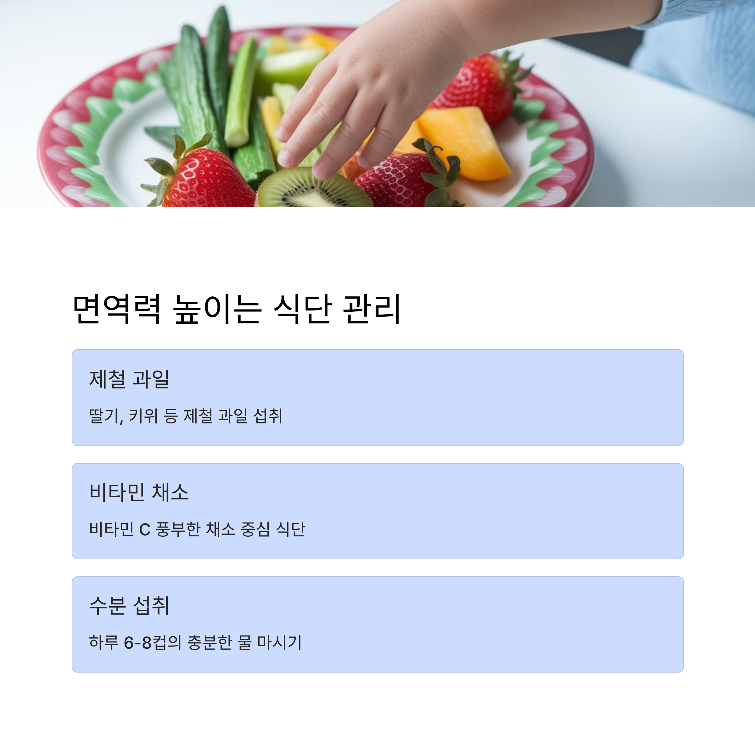 또, 충분한 수면과 규칙적인 생활 습관도 면역력 유지에 큰 역할을 합니다. 늦은 밤까지 스마트폰이나 TV 시청은 피하고, 일정한 취침·기상 시간을 지켜 아이의 생체 리듬을 안정시켜 주세요.