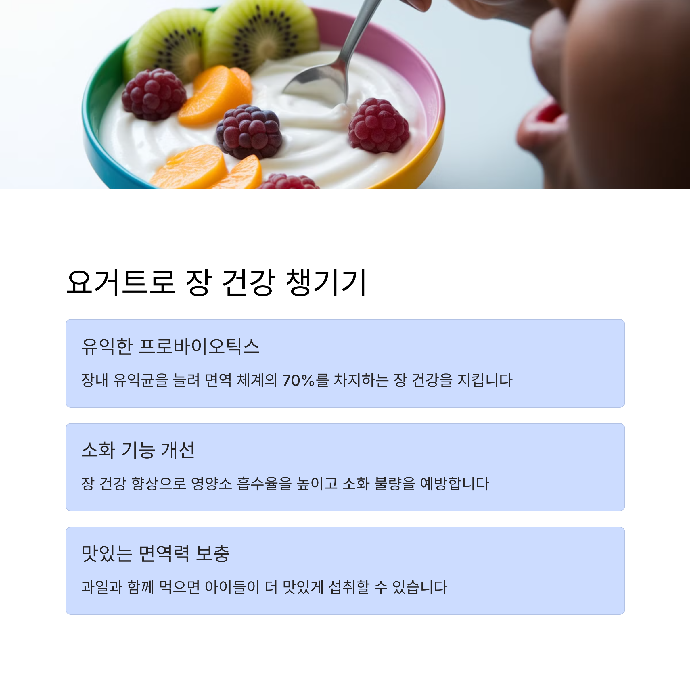 요거트에 함유된 유산균은 장내 환경을 개선하고 면역세포의 활성도를 높여줍니다. 유아의 면역력은 장 건강과 밀접한 관련이 있으므로 매일 조금씩 섭취하는 것이 좋습니다.