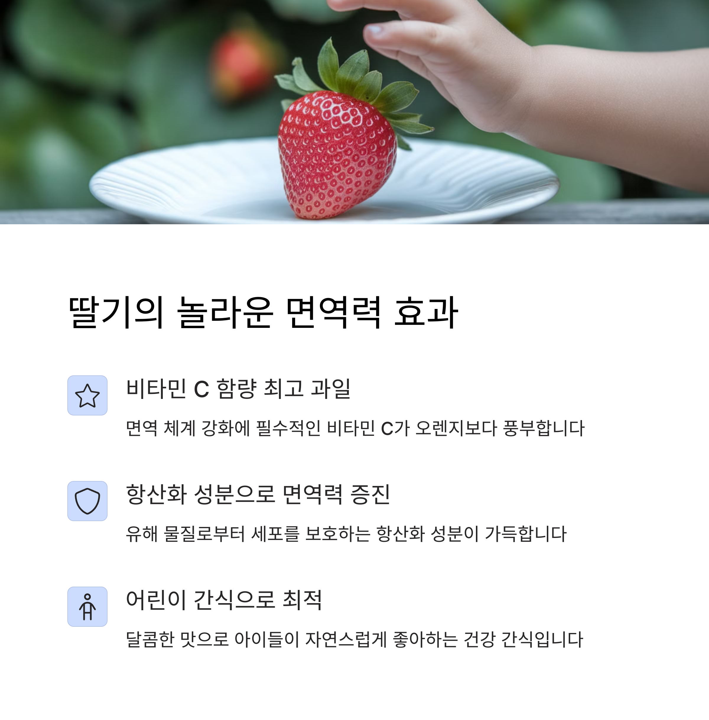 딸기는 유아들이 좋아하는 과일 중 하나이면서, 면역력 강화에 효과적인 비타민 C가 풍부한 식품입니다. 비타민 C는 면역세포의 기능을 높여 감기와 바이러스 감염을 예방하는 데 도움이 됩니다.