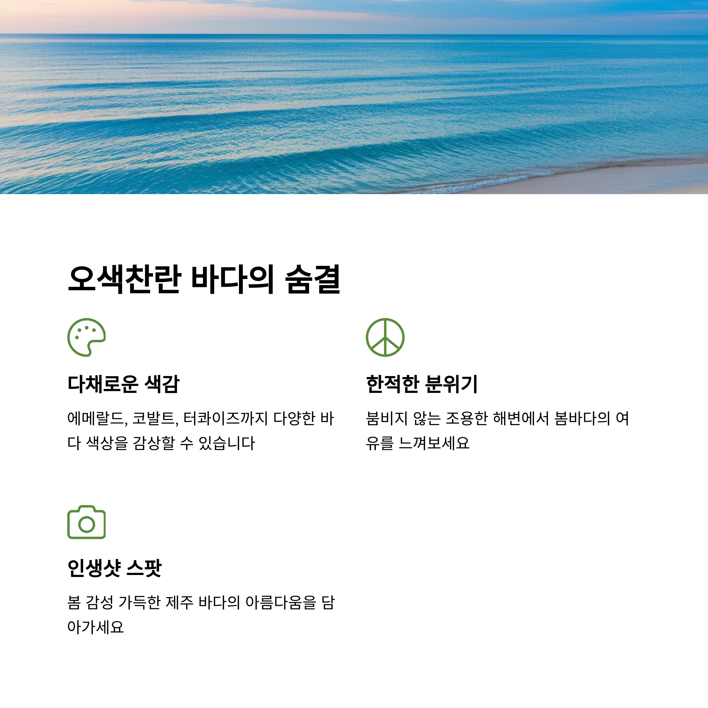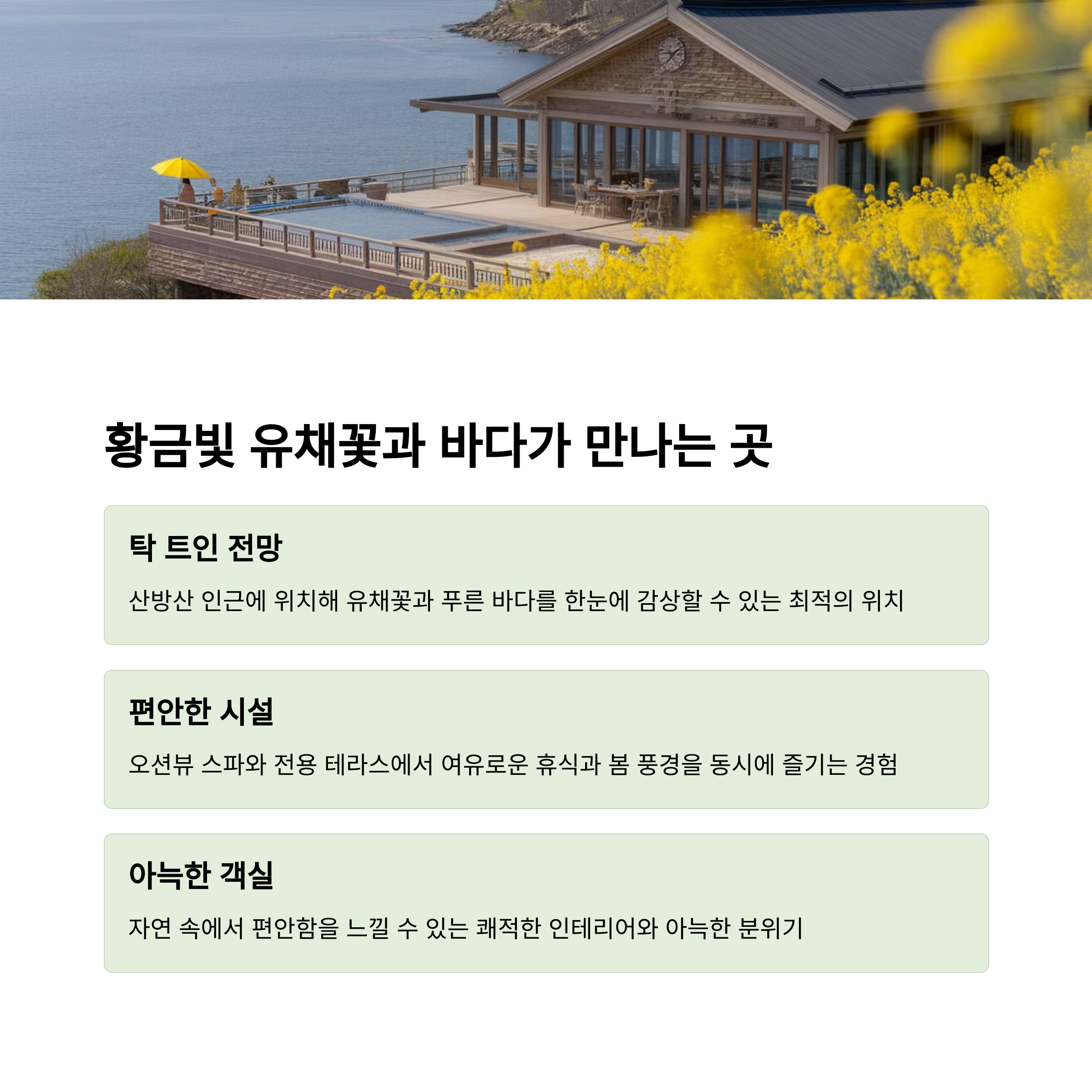 | 유채꽃 뷰, 오션뷰, 자연풍광이 함께하는 공간 | 자연과 바다가 함께 어우러진 힐링 공간 | 인생샷 명소와 여유로움을 동시에! |