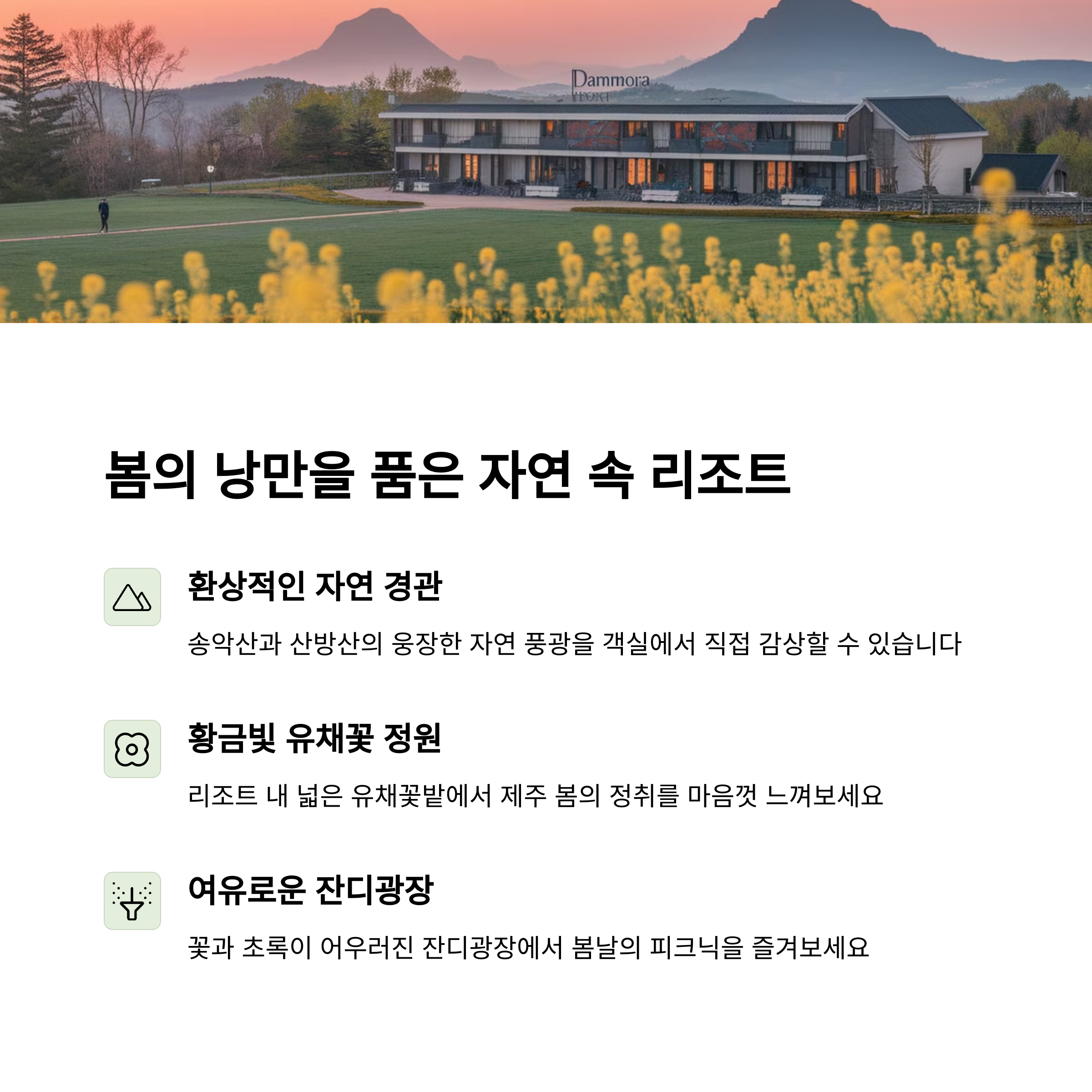 유채꽃과 더불어 봄 감성을 고스란히 느낄 수 있는 숙소로는 담모라 리조트를 추천드립니다. 이곳은 송악산과 산방산 인근의 자연 풍광을 그대로 담아낸 리조트로, 유채꽃밭과 잔디광장이 조성되어 있어 자연과 어우러진 여유로운 산책을 즐기기에 제격입니다. 넓은 공간 덕분에 아이들과 함께하는 가족 여행은 물론, 연인과의 감성 여행으로도 탁월한 선택이 될 수 있습니다. 봄을 닮은 이 풍경 속에서 새로운 에너지를 충전해보세요.