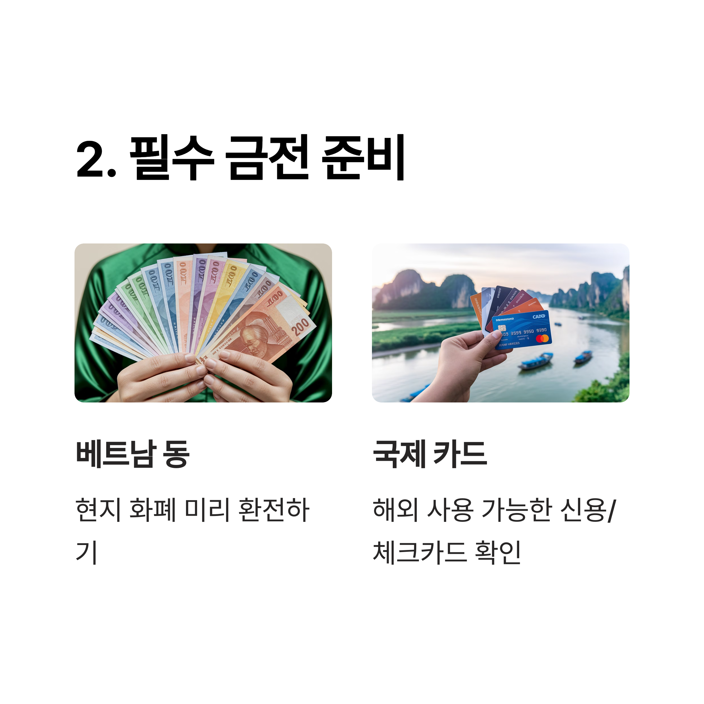 현지 화폐인 베트남 동(VND)은 공항 환전소 또는 국내 은행에서 미리 준비할 수 있으며, 국제 결제가 가능한 신용카드도 필수입니다. 교통 앱, 지도 앱, 번역 앱 등은 현지에서 유용하게 활용됩니다.