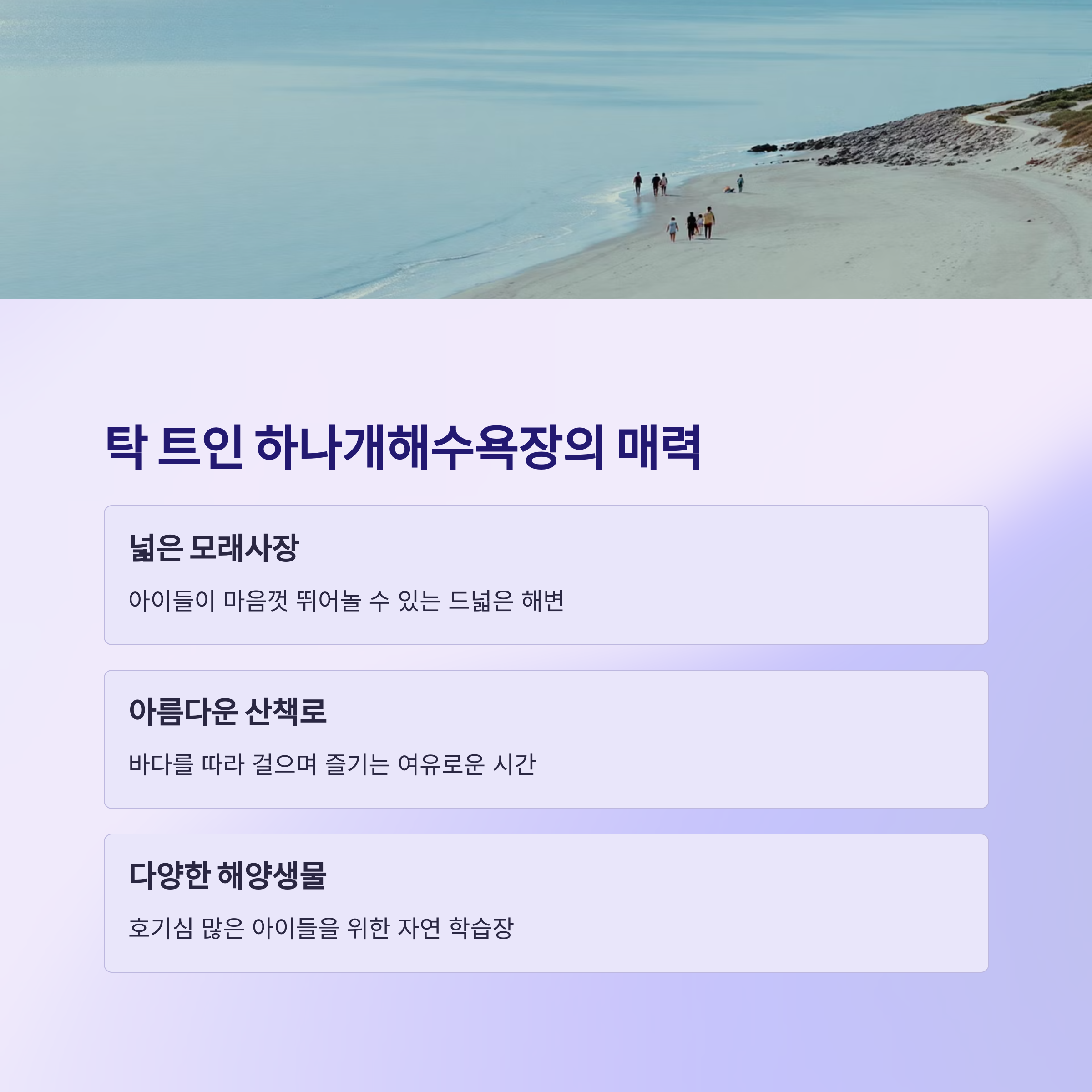 무의도에 위치한 하나개해수욕장은 드넓은 백사장과 소나무 산책로가 인상적인 곳입니다. 해수욕장은 물놀이는 물론, 바다 풍경을 보며 여유롭게 산책할 수 있는 코스가 잘 정비되어 있어 아이와 함께 걷기에 무리가 없습니다. 썰물 때는 길게 드러나는 모래사장에서 바다 생물을 관찰할 수 있고, 해변을 따라 이어지는 데크길은 가족 사진 명소로도 손꼽힙니다.