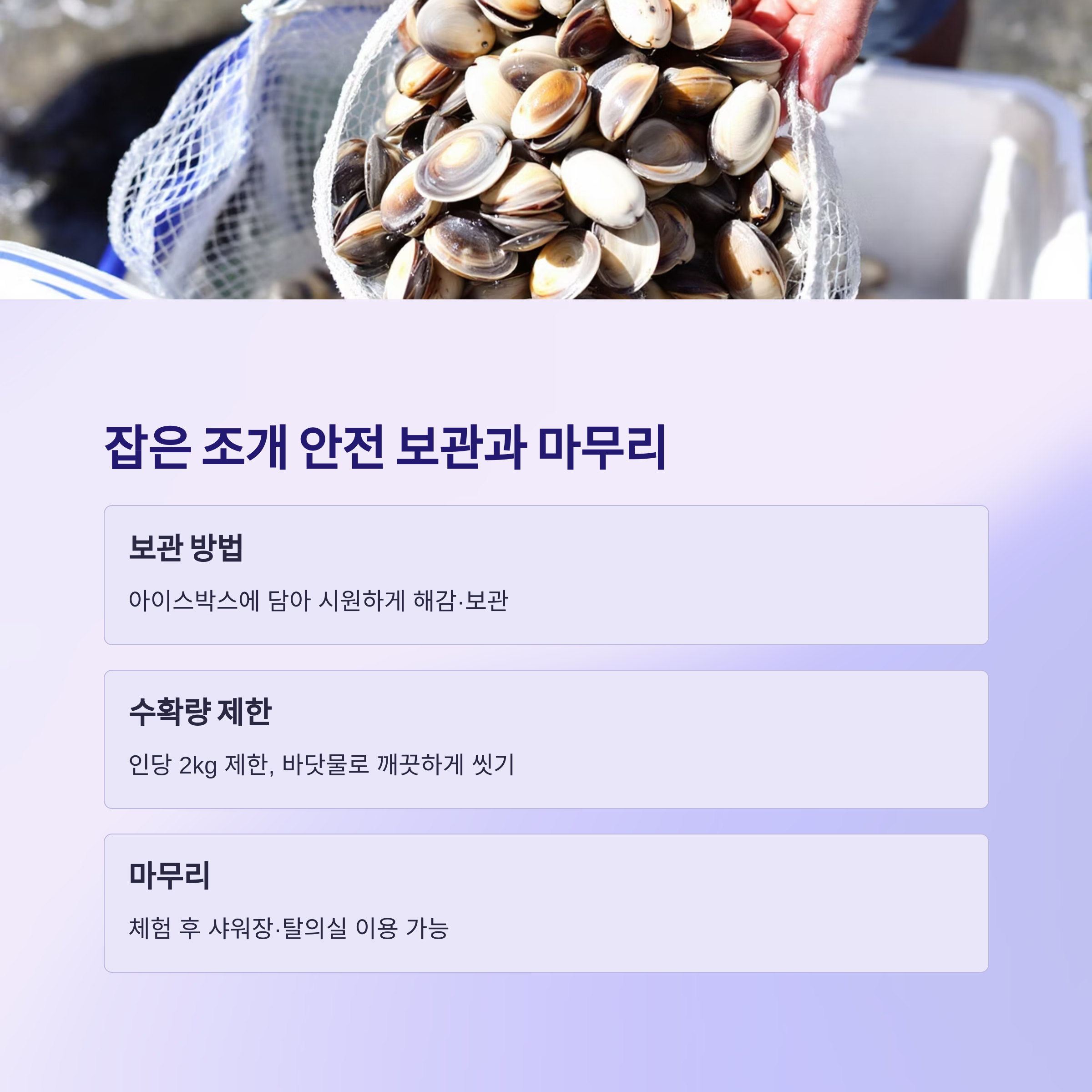 조개는 해감이 필요하므로 아이스박스나 쿨러에 담아 시원하게 보관하는 것이 좋습니다. 갯벌에 오래 앉아 있어야 하니 아이용 방수 매트나 작은 의자를 준비하면 더욱 편리합니다. 체험 후에는 인근 샤워장을 이용하면 깔끔하게 마무리할 수 있습니다.