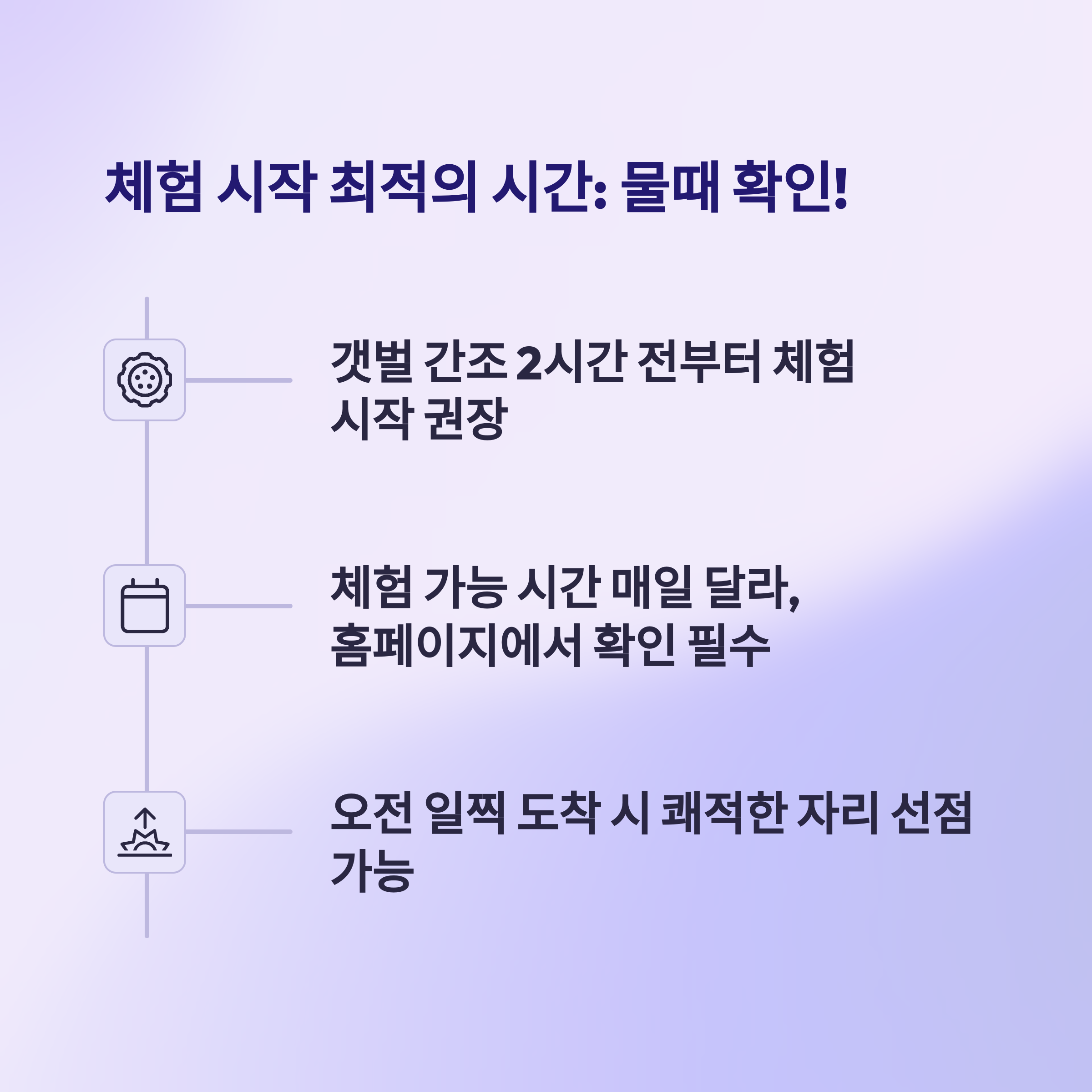 조개는 간조(물이 가장 빠졌을 때) 시간에 가장 많이 드러나며, 간조 시간 2시간 전부터 시작하는 것이 가장 좋습니다. 체험 시간대가 짧기 때문에 사전에 물때를 검색하고 일정을 맞추는 것이 매우 중요합니다.