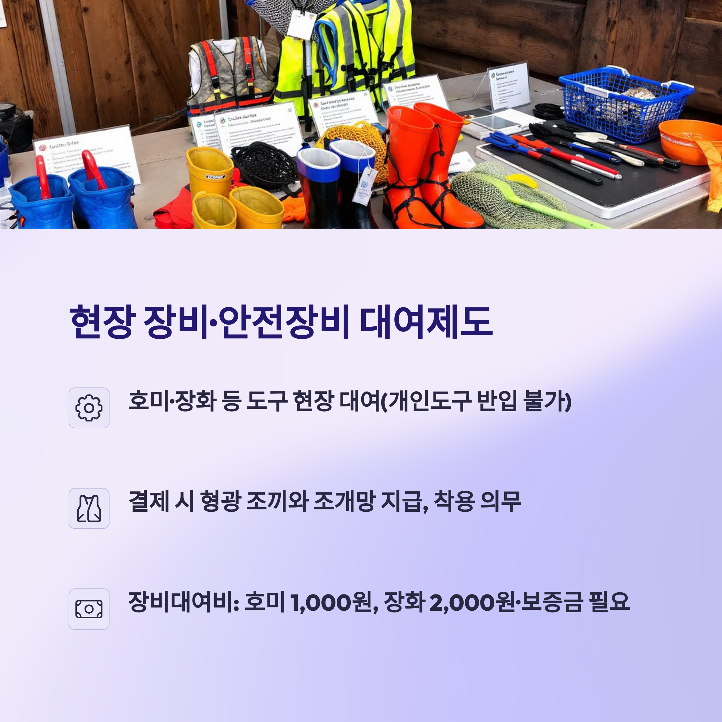 마시안갯벌에서는 형광 조끼를 지급하며, 이는 반드시 착용해야 합니다. 이는 안전 확보와 참가자 식별을 위한 조치입니다. 조개잡이용 호미나 삽은 현장에서 대여가 가능하므로, 무리하게 준비할 필요는 없습니다. 가장 중요한 것은 물때를 확인하는 것입니다.