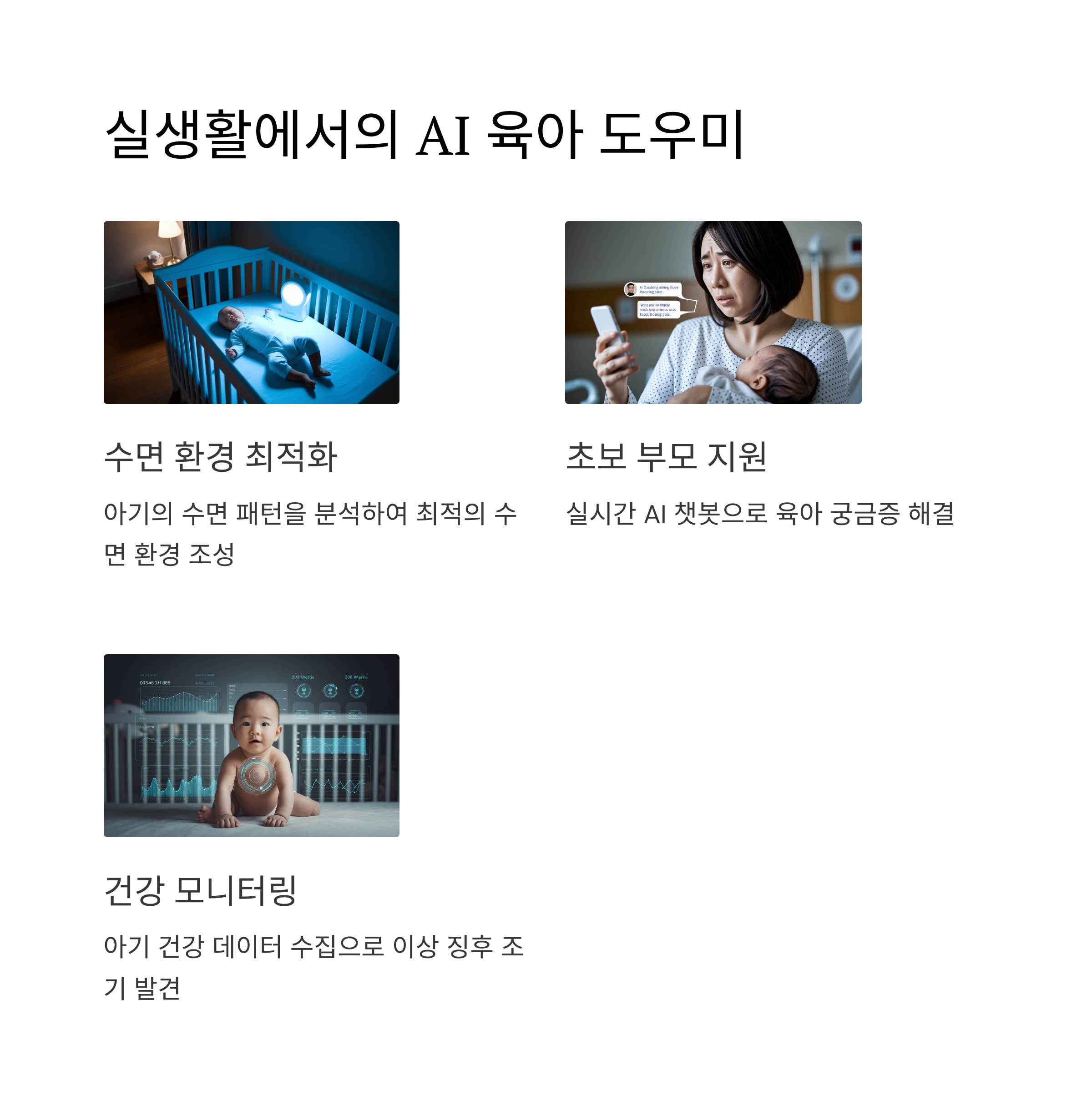 | 대표적인 AI 육아 도구 | 스마트 스피커, 베이비 모니터, 육아 챗봇, 자동 수면 모니터 등 |