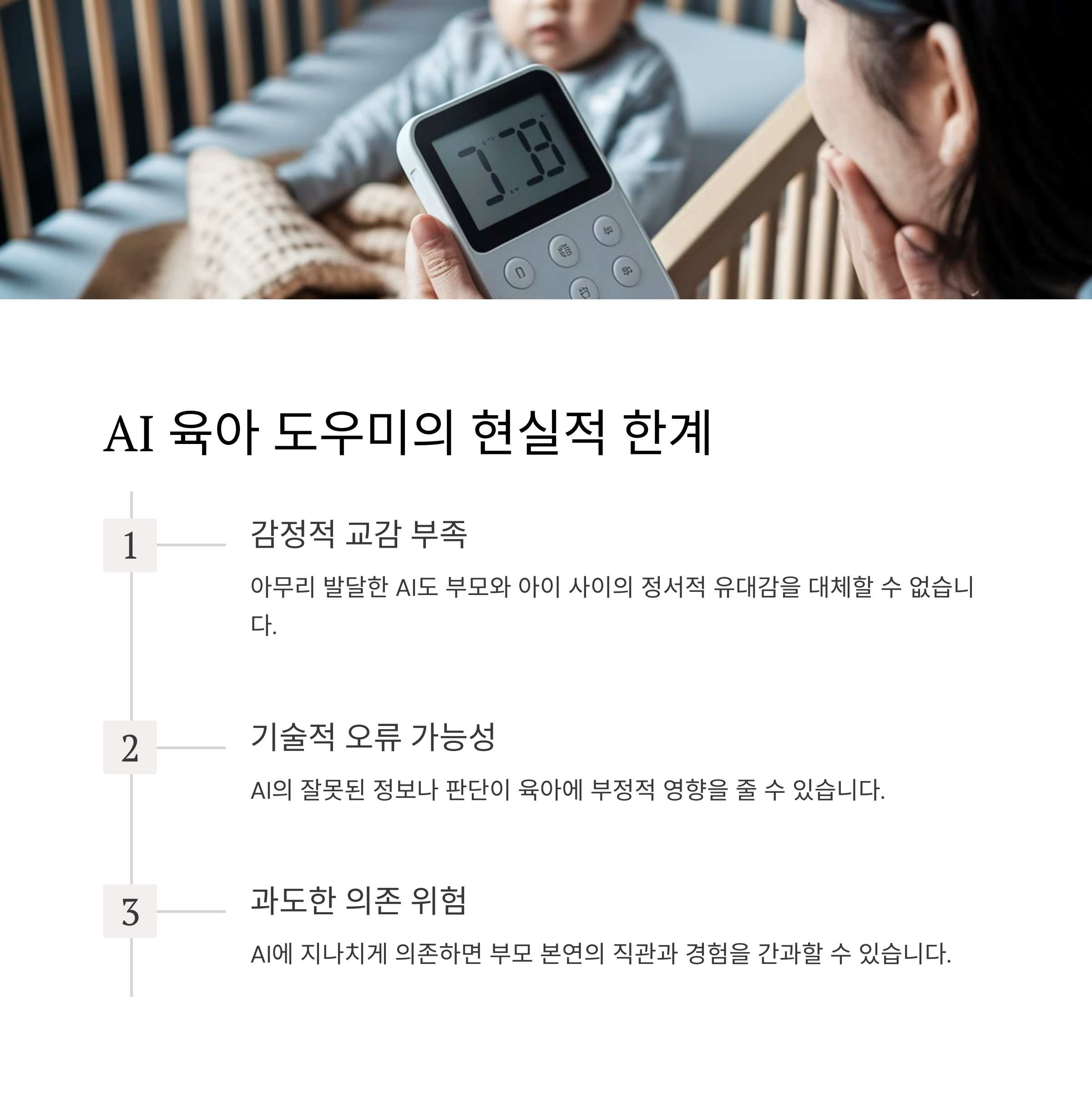 AI 육아 도우미는 부모의 역할을 대체하는 것이 아니라 보조하는 역할을 합니다. AI는 데이터를 분석하여 맞춤형 솔루션을 제공하지만, 부모와의 감정적인 교감은 기술로 대체할 수 없습니다.