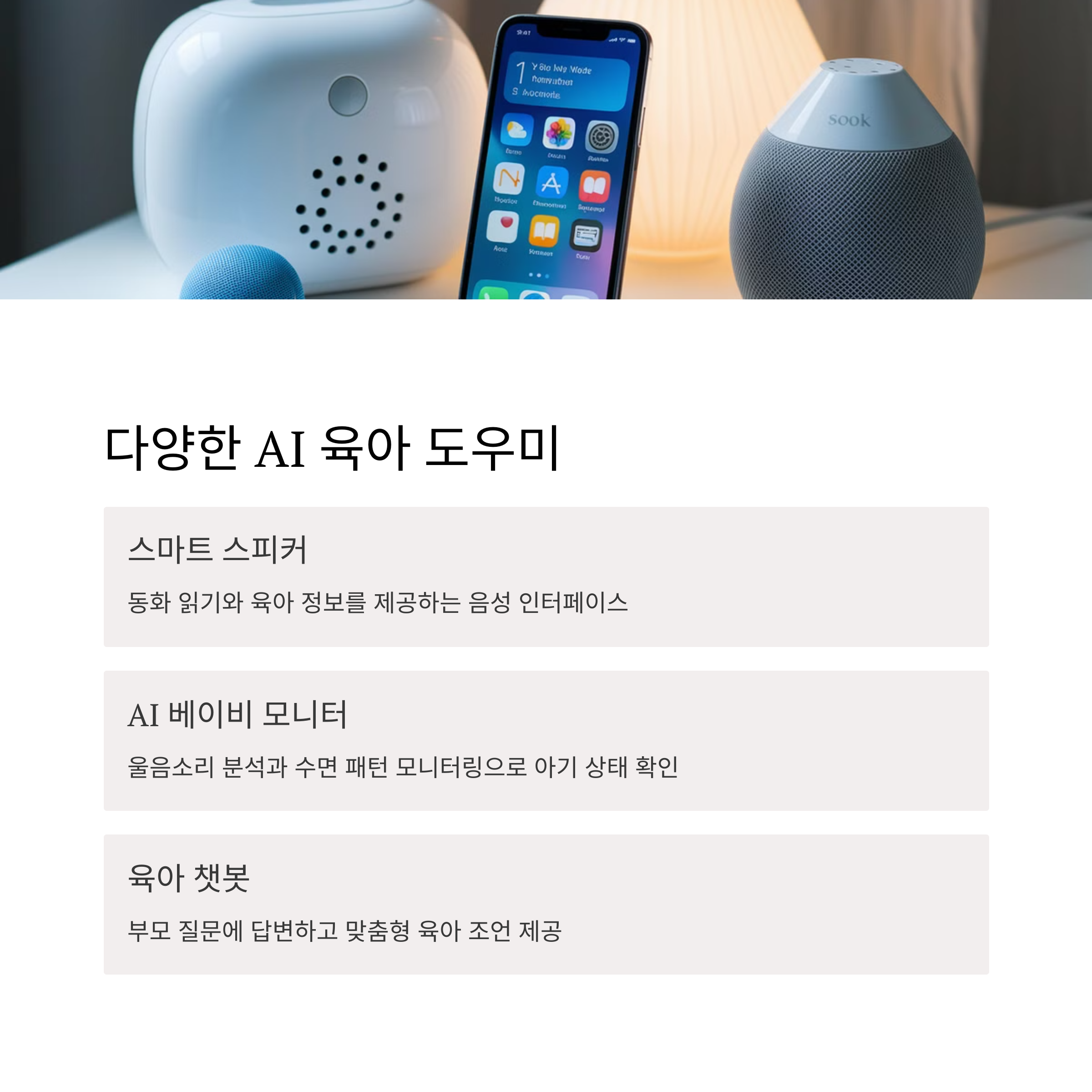 | 대표적인 AI 육아 도구 | 스마트 스피커, 베이비 모니터, 육아 챗봇, 자동 수면 모니터 등 |