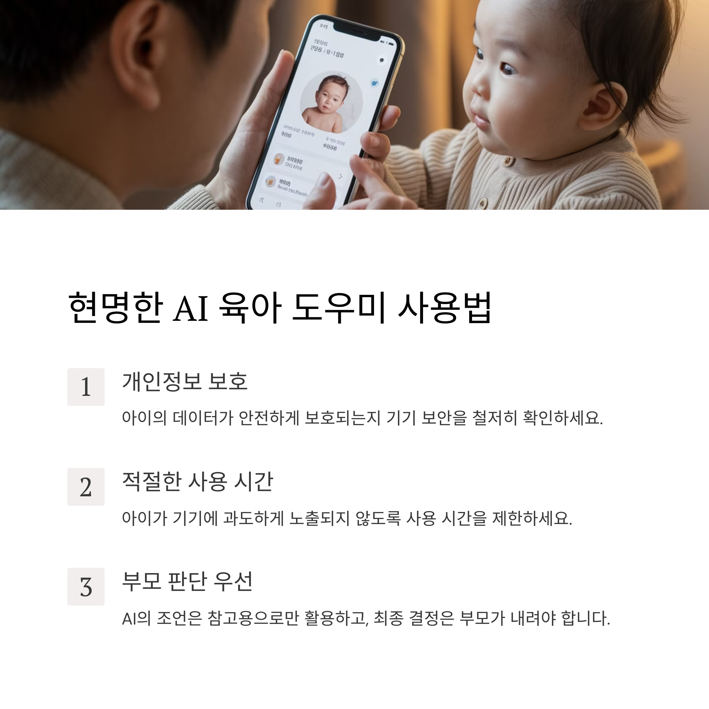 결국 AI 육아 도우미는 부모의 역할을 대신하는 것이 아니라, 육아를 보조하는 도구로 활용해야 합니다. AI의 도움을 받되, 부모가 직접 아이와 교감하는 시간이 줄어들지 않도록 균형을 맞추는 것이 중요합니다. 또한 AI 제품을 선택할 때는 보안 문제를 고려하고, 신뢰할 수 있는 브랜드를 선택하는 것이 필요합니다.