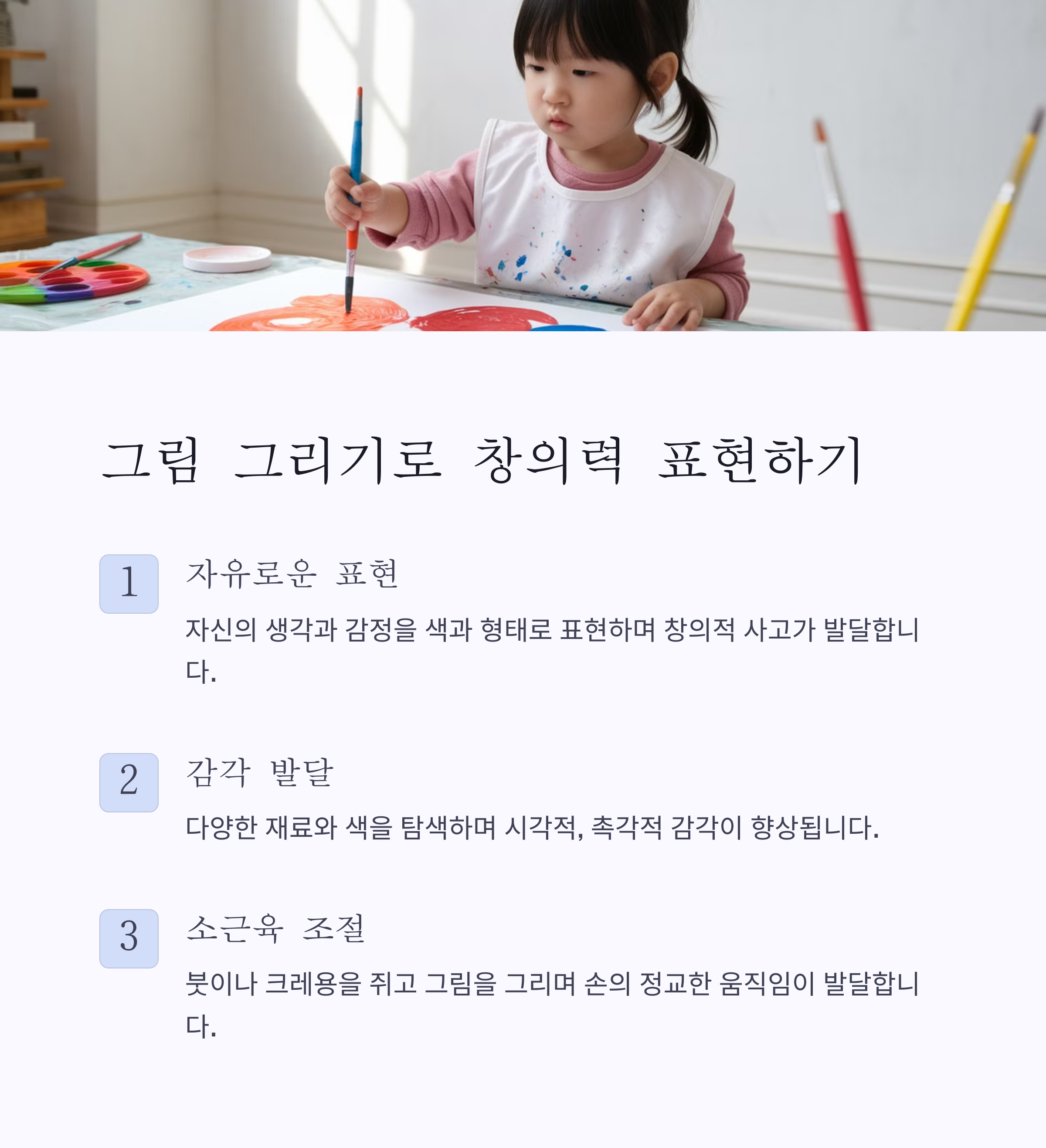 | 그림 그리기 | 감각 발달, 창의력 | 2세 이상 |