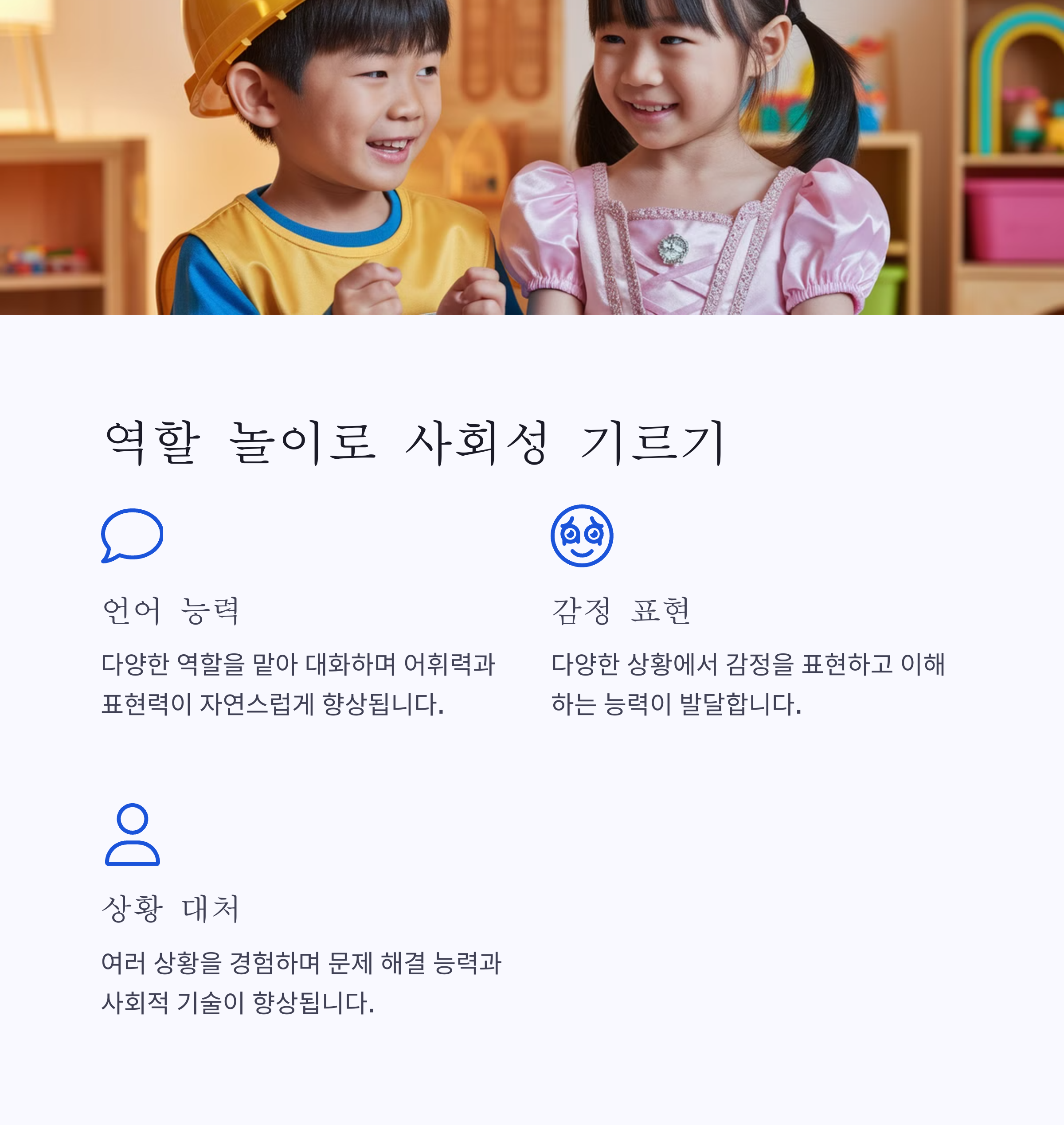 | 역할 놀이 | 언어 발달, 사회성 향상 | 4세 이상 |